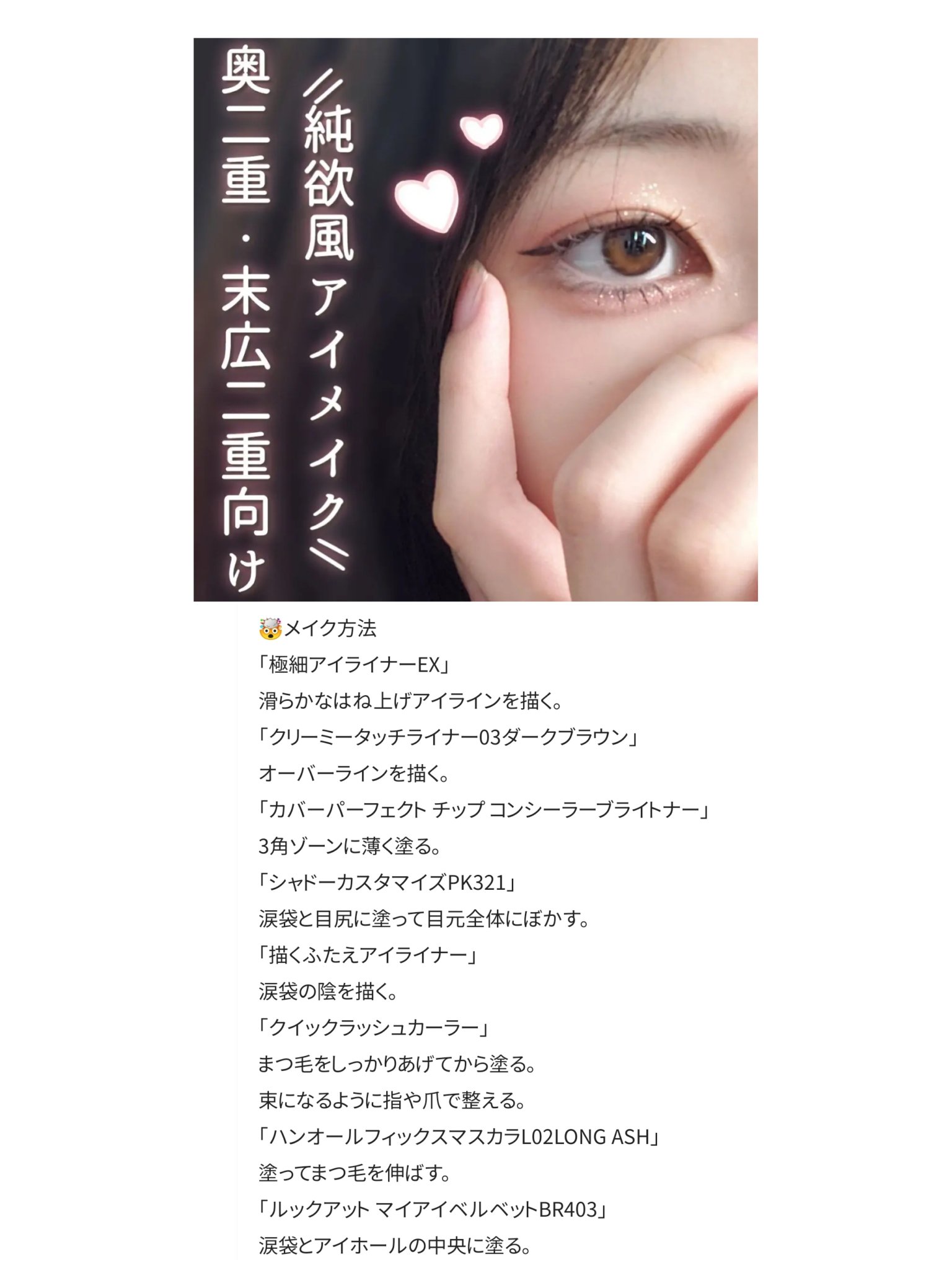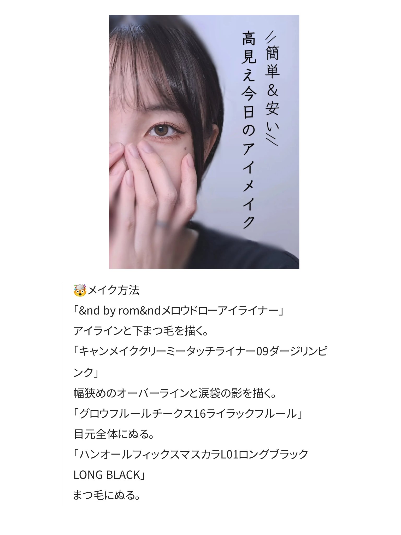 「キャンメイククリーミータッチライナー03ダークブラウン」 アイラインを描く。 「09ダージリンピンク」 オーバーラインと目頭切開ラインを描く。 「BLEND BERRYオーラクリエイション102ザクロ&シュガリーピンク」 右上の薄ピンクをアイホールと涙袋に塗る。(アイラインをぼかしながら) 右下の茶色を目尻に塗る。 「CEZANNE描くふたえアイライナー」 涙袋の影を描く。二重の線をなぞって二重の堀を深くする。 オーバーラインをなぞる。 「PERIPERAシュガー トゥインクル リキッド グリッター02SODAPOP FLAKES」 涙袋と目頭、アイホールの中央に塗る。(アイホールの中央はぼかす) 「キャンメイククイックラッシュカーラー透明タイプ」 まつ毛をしっかりあげてから塗る。爪で軽くつまみ束を作る。 「MAJOLICA MAJORCAラッシュエキスパンダー ロングロングロング EXOR505ヴィンテージオレンジ 歩幅」 毛先に塗り、指で整えて完成。(塗りすぎるとまつ毛の存在感が消えてしまうため塗りすぎ注意)