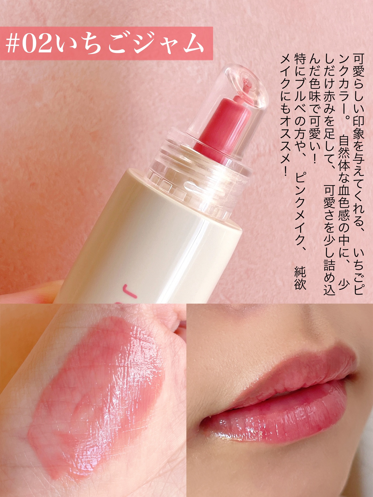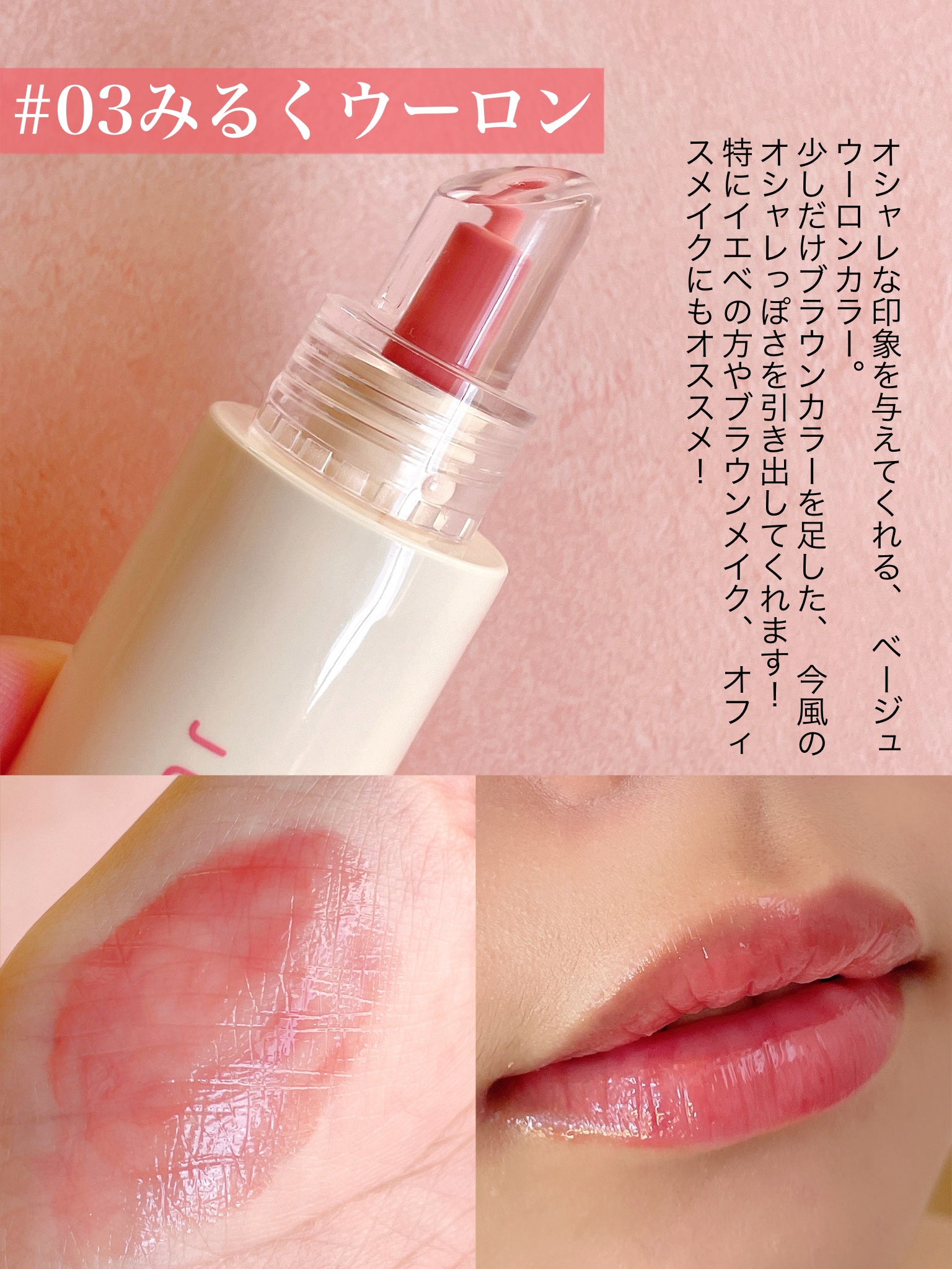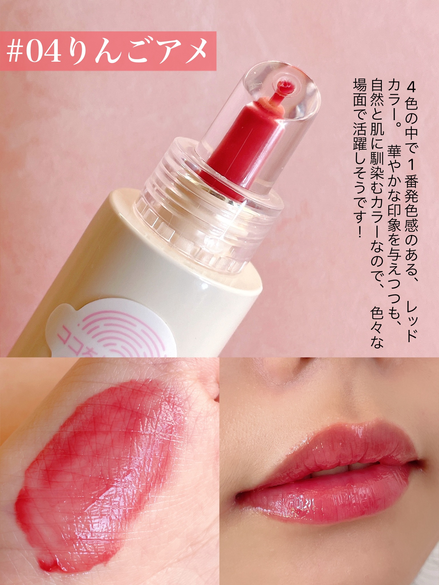 - 保湿成分たっぷりで、うるうるのぽってり唇*1を長時間演出。 透け感×馴染みのいいカラーで、いつものリップに潤いとあざとさをプラス! ノールックで塗り直しできるので、学校やお仕事の日にもオススメ。 01 ももドロップ ももドロップはドロップのような透け感と低彩度のももピンクで一番*2ナチュラルなカラー。 赤ちゃんのように自然な血色感で、白湯メイクにオススメ。 02 いちごジャム いちごジャムはジャムのようなぷるぷる感と、キュートな少女ピンクの定番カラー。 甘くてカワイイ雰囲気をまといたい日や、純欲メイクにオススメ。 03 みるくウーロン みるくウーロンはクリーミーなベージュウーロンカラーで一番*2なじみのいい粘膜つやカラー。 ちょっと血色を足したいすっぴんメイクや、スクールメイク、お仕事メイクにオススメ。 04 りんごアメ りんごアメは完熟りんごアメのようなちゅるちゅる火照りレッドカラー。 ぽってりリップで色気を出したい日や、ベースリップの発色が物足りない時にも。 *1メイク効果 *2ブランド内において