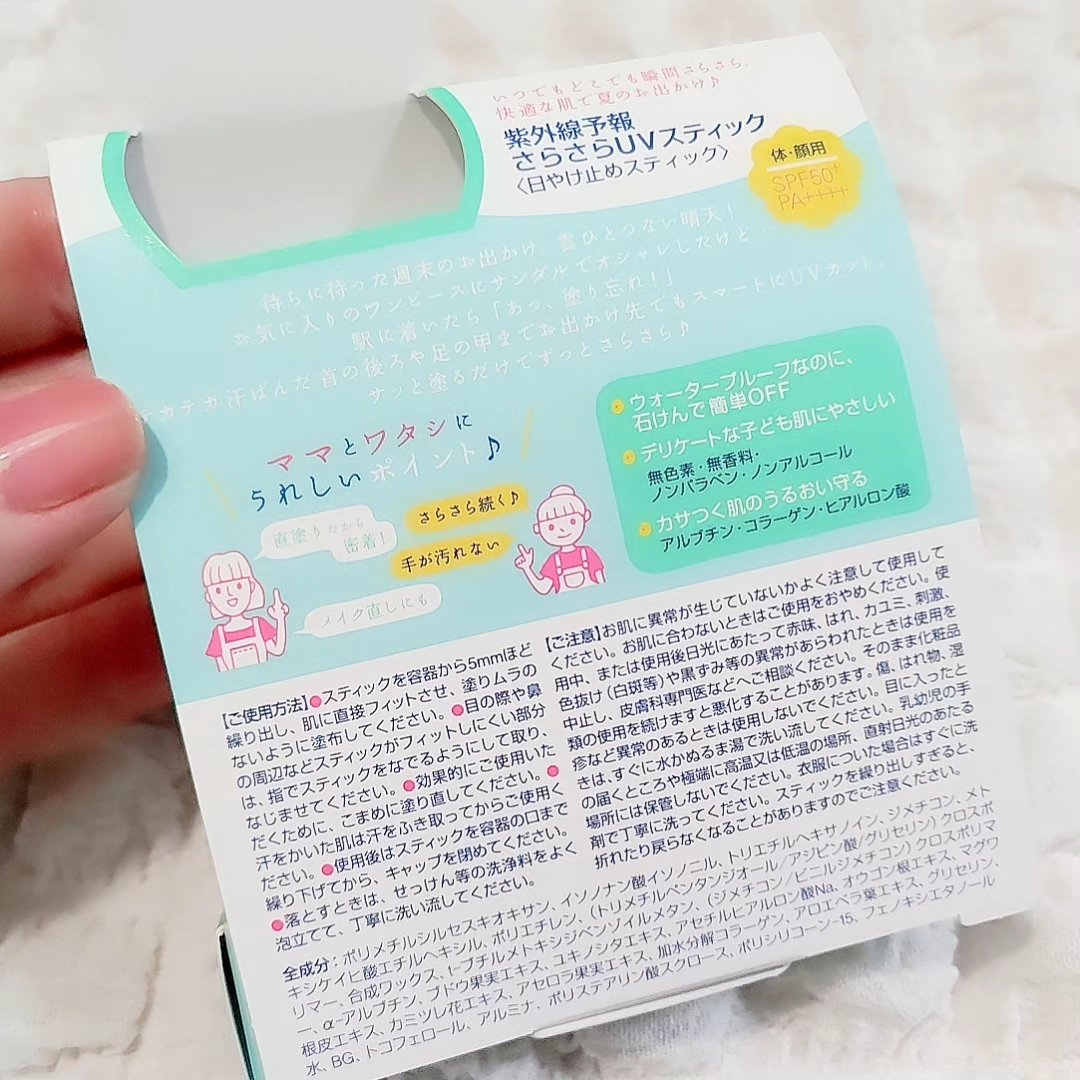 手が汚れないから塗り直しにもピッタリ! スティックタイプの日焼け止めです サッと塗るだけ、でもすぐサラサラ✨ 外出先でも塗り直しがしやすいのが良かった 1歳から使えるやさしい製品です
