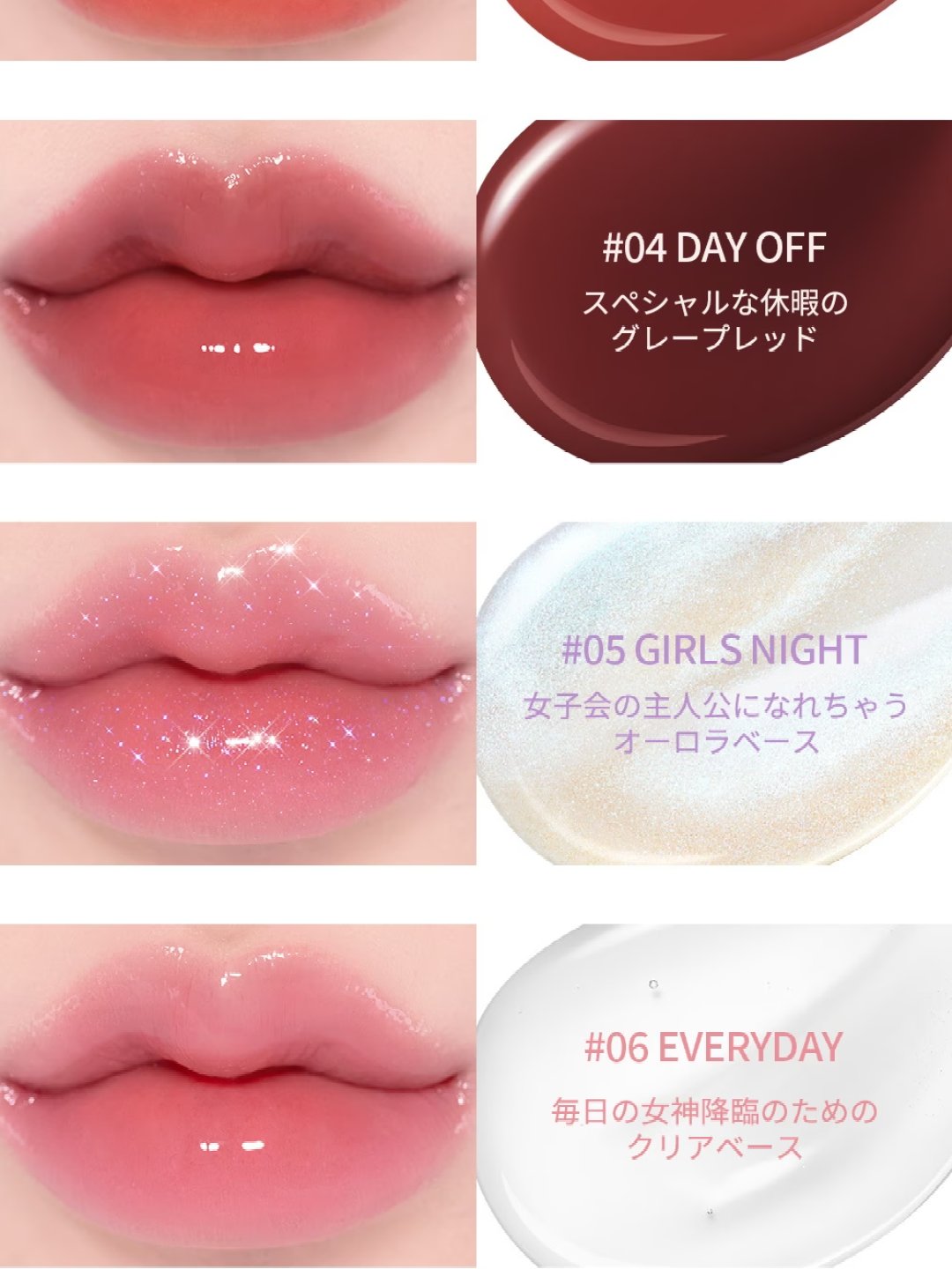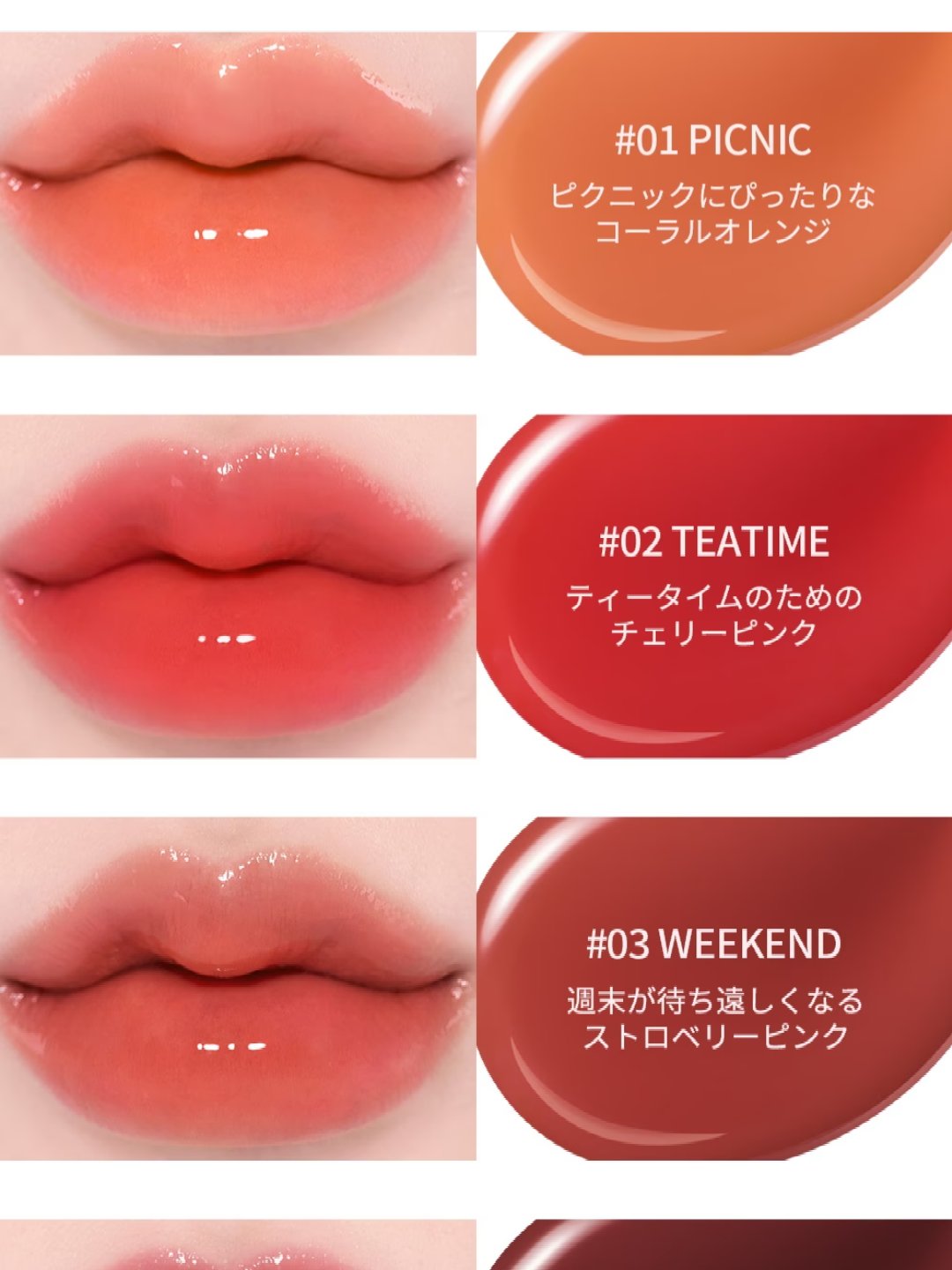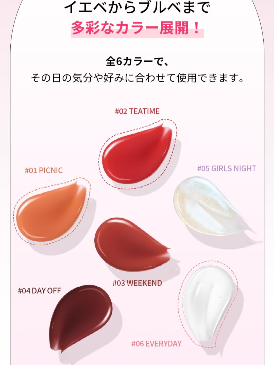 - <01 ピクニック> 水添ポリイソブテン、リンゴ酸ジイソステアリル、トリメリト酸トリトリデシル、テトラエチルヘキサン酸ペンタエリスリチル、オクチルドデカノール、ジメチルシリル化シリカ、メントール、ハナスゲ根エキス、ホホバ種子油、ザクロ花エキス、トウガラシ果実エキス、カノラ油、ショウガ根油、イソステアリン酸ソルビタン、(VP/ヘキサデセン)コポリマー、バニリルブチル、トリイソステアリン酸ポリグリセリル-2、酢酸トコフェロール、ジイソステアリン酸ポリグリセリル-2、トコフェロール、ジイソステアリン酸ポリグリセリル-3、ニコチン酸メチル、デヒドロ酢酸、酸化チタン、黄4、酸化鉄、黄5、赤230(1)、赤202 <02 ティータイム> 水添ポリイソブテン、リンゴ酸ジイソステアリル、トリメリト酸トリトリデシル、テトラエチルヘキサン酸ペンタエリスリチル、オクチルドデカノール、ジメチルシリル化シリカ、メントール、ハナスゲ根エキス、ホホバ種子油、ザクロ花エキス、トウガラシ果実エキス、カノラ油、ショウガ根油、イソステアリン酸ソルビタン、(VP/ヘキサデセン)コポリマー、バニリルブチル、トリイソステアリン酸ポリグリセリル-2、ジイソステアリン酸ポリグリセリル-2、酢酸トコフェロール、トコフェロール、ジイソステアリン酸ポリグリセリル-3、ニコチン酸メチル、デヒドロ酢酸、赤230(1)、黄4、酸化チタン、赤202、酸化鉄 <03 ウィークエンド> 水添ポリイソブテン、リンゴ酸ジイソステアリル、トリメリト酸トリトリデシル、テトラエチルヘキサン酸ペンタエリスリチル、オクチルドデカノール、ジメチルシリル化シリカ、メントール、ハナスゲ根エキス、ホホバ種子油、ザクロ花エキス、トウガラシ果実エキス、カノラ油、ショウガ根油、イソステアリン酸ソルビタン、(VP/ヘキサデセン)コポリマー、バニリルブチル、トリイソステアリン酸ポリグリセリル-2、酢酸トコフェロール、ジイソステアリン酸ポリグリセリル-2、トコフェロール、ジイソステアリン酸ポリグリセリル-3、ニコチン酸メチル、デヒドロ酢酸、酸化鉄、酸化チタン、赤104(1)、黄4 <04 デイオフ> 水添ポリイソブテン、リンゴ酸ジイソステアリル、トリメリト酸トリトリデシル、テトラエチルヘキサン酸ペンタエリスリチル、オクチルドデカノール、ジメチルシリル化シリカ、メントール、ハナスゲ根エキス、ホホバ種子油、ザクロ花エキス、トウガラシ果実エキス、カノラ油、ショウガ根油、イソステアリン酸ソルビタン、(VP/ヘキサデセン)コポリマー、バニリルブチル、トリイソステアリン酸ポリグリセリル-2、酢酸トコフェロール、ジイソステアリン酸ポリグリセリル-2、トコフェロール、ジイソステアリン酸ポリグリセリル-3、ニコチン酸メチル、デヒドロ酢酸、酸化鉄、赤227、酸化チタン、赤202、青1 <05 ガールズナイト> 水添ポリイソブテン、リンゴ酸ジイソステアリル、トリメリト酸トリトリデシル、テトラエチルヘキサン酸ペンタエリスリチル、メントール、バニリルブチル、ジメチルシリル化シリカ、ハナスゲ根エキス、ホホバ種子油、ザクロ花エキス、トウガラシ果実エキス、カノラ油、ショウガ根油、ホウケイ酸(Ca/Na)、オクチルドデカノール、ホウケイ酸(Ca/Al)、酢酸トコフェロール、シリカ、トコフェロール、ジイソステアリン酸ポリグリセリル-3、ニコチン酸メチル、酸化スズ、デヒドロ酢酸、酸化チタン <06 エブリデイ> 水添ポリイソブテン、リンゴ酸ジイソステアリル、トリメリト酸トリトリデシル、テトラエチルヘキサン酸ペンタエリスリチル、メントール、バニリルブチル、ジメチルシリル化シリカ、オクチルドデカノール、ハナスゲ根エキス、ホホバ種子油、ザクロ花エキス、トウガラシ果実エキス、カノラ油、ショウガ根油、酢酸トコフェロール、トコフェロール、ジイソステアリン酸ポリグリセリル-3、ニコチン酸メチル、デヒドロ酢酸 <07 メロディー> 水添ポリイソブテン、リンゴ酸ジイソステアリル、トリメリト酸トリトリデシル、テトラエチルヘキサン酸ペンタエリスリチル、ジメチルシリル化シリカ、メントール、オクチルドデカノール、バニリルブチル、ハナスゲ根エキス、ホホバ種子油、ザクロ花エキス、カノラ油、トウガラシ果実エキス、ショウガ根油、ホウケイ酸(Ca/Na)、イソステアリン酸ソルビタン、(VP/ヘキサデセン)コポリマー、トリイソステアリン酸ポリグリセリル-2、酢酸トコフェロール、ジイソステアリン酸ポリグリセリル-2、トコフェロール、ジイソステアリン酸ポリグリセリル-3、ニコチン酸メチル、酸化スズ、デヒドロ酢酸、酸化チタン、酸化鉄、赤104(1) <08 ステラ> 水添ポリイソブテン、リンゴ酸ジイソステアリル、トリメリト酸トリトリデシル、テトラエチルヘキサン酸ペンタエリスリチル、ジメチルシリル化シリカ、メントール、オクチルドデカノール、バニリルブチル、ハナスゲ根エキス、ホホバ種子油、ザクロ花エキス、カノラ油、トウガラシ果実エキス、