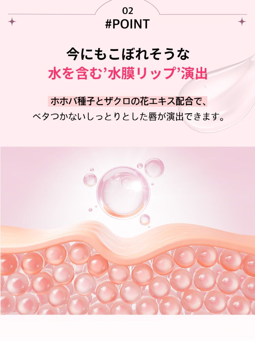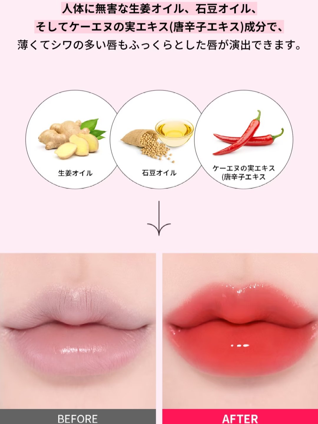 - ※2024年12月〜一部の商品原材料を順次変更。尚、これに係る商品の返品・交換は承っておりません。 保湿感が持続しながらもべた付かない、ぷっくり質感のリップに ●3つのハリケア成分 ボルフェリン*、カプサイシン*、ジンジャーオイル*を配合 ●3つの保湿成分 ホホ種子油*、ザクロ花エキス*、カノラ油 唇の保湿のためのこだわり成分配合。乾燥が原因による唇の荒れを防ぎ、ショウガ根エキスが、ハリと潤いを与え、ぷるんとしたガラス玉リップを演出します。 チップは唇にフィットしやすいバレーシューズ型を採用。塗りやすさも特徴のひとつです。 *配合目的:皮膚コンディショニング剤として