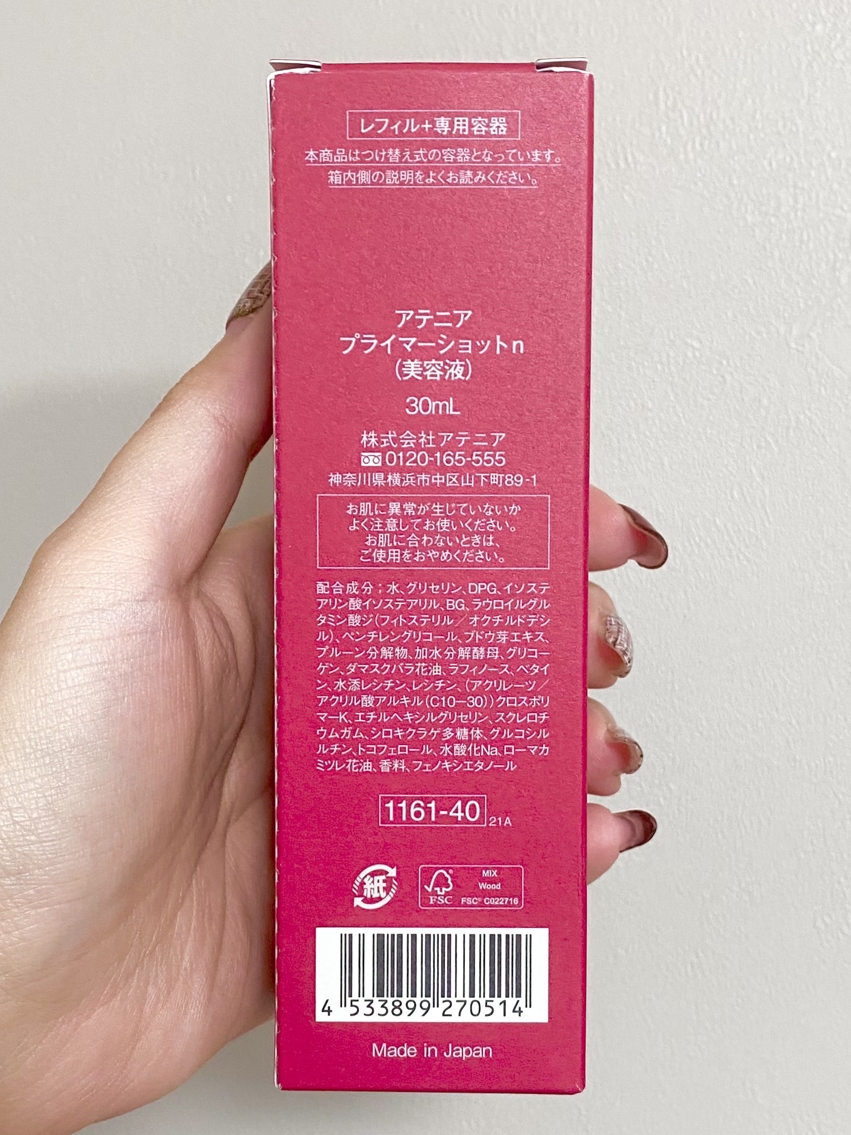 - <レフィル> 水、ペンチレングリコール、BG、グリセリン、フェノキシエタノール、香料、トコフェロール、レシチン、エチルヘキシルグリセリン、DPG、プルーン分解物、水添レシチン、水酸化Na、ベタイン、ローマカミツレ花油、ラフィノース、グルコシルルチン、加水分解酵母、ブドウ芽エキス、ダマスクバラ花油、イソステアリン酸イソステアリル、ラウロイルグルタミン酸ジ(フィトステリル/オクチルドデシル)、シロキクラゲ多糖体、スクレロチウムガム、グリコーゲン、(アクリレーツ/アクリル酸アルキル(C10-30))クロスポリマーK