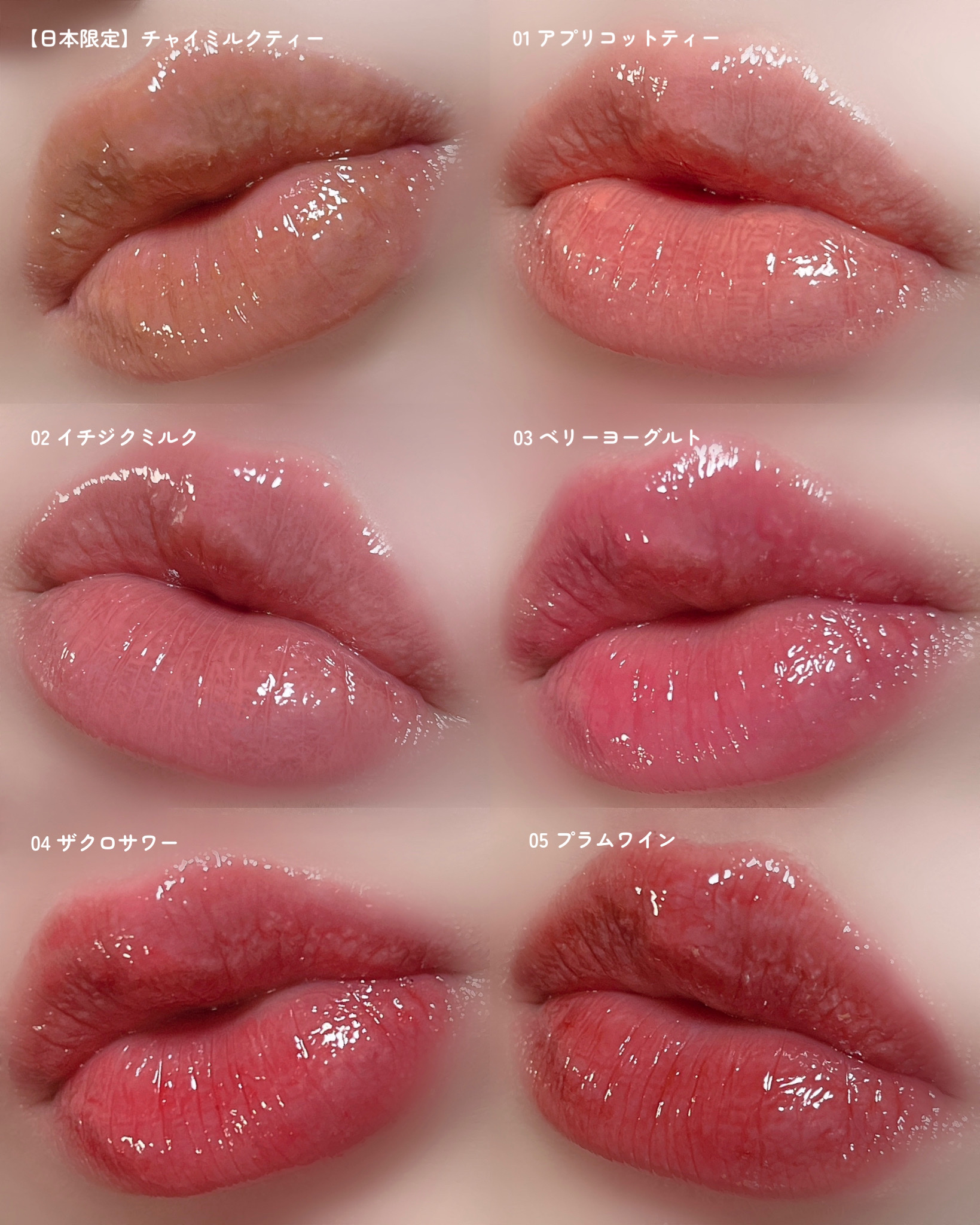 - <01 アプリコットティー> リンゴ酸ジイソステアリル、ダイマージリノール酸ダイマージリノレイルビス(ベヘニル/イソステアリル/フィトステリル)、ビスジグリセリルポリアシルアジペート-2、トリイソステアリン酸ポリグリセリル-2、水添ポリイソブテン、パラフィン、マイクロクリスタリンワックス、ウルシ果皮ロウ、ハチミツエキス、センチフォリアバラ花エキス、マンゴー果実エキス、カニナバラ果実エキス、アーモンド油、アルガニアスピノサ核油、アンズ核油、オリーブ果実油、シア脂、ツバキ種子油、ホホバ種子油、月見草油、BG、トリ(カプリル酸/カプリン酸)グリセリル、1,2-ヘキサンジオール、イソステアリン酸ソルビタン、酢酸トコフェロール、フェノキシエタノール、酸化鉄、酸化チタン、赤202、香料 <02 イチジクミルク> リンゴ酸ジイソステアリル、ダイマージリノール酸ダイマージリノレイルビス(ベヘニル/イソステアリル/フィトステリル)、ビスジグリセリルポリアシルアジペート-2、トリイソステアリン酸ポリグリセリル-2、水添ポリイソブテン、パラフィン、マイクロクリスタリンワックス、ウルシ果皮ロウ、ハチミツエキス、センチフォリアバラ花エキス、マンゴー果実エキス、カニナバラ果実エキス、アーモンド油、アルガニアスピノサ核油、シア脂、オリーブ果実油、アンズ核油、ツバキ種子油、ホホバ種子油、月見草油、BG、トリ(カプリル酸/カプリン酸)グリセリル、1,2-ヘキサンジオール、イソステアリン酸ソルビタン、酢酸トコフェロール、フェノキシエタノール、酸化鉄、酸化チタン、赤202、青1、香料 <03 ベリーヨーグルト> リンゴ酸ジイソステアリル、ダイマージリノール酸ダイマージリノレイルビス(ベヘニル/イソステアリル/フィトステリル)、ビスジグリセリルポリアシルアジペート-2、トリイソステアリン酸ポリグリセリル-2、水添ポリイソブテン、パラフィン、マイクロクリスタリンワックス、ウルシ果皮ロウ、ハチミツエキス、センチフォリアバラ花エキス、マンゴー果実エキス、カニナバラ果実エキス、アーモンド油、アルガニアスピノサ核油、シア脂、オリーブ果実油、アンズ核油、ツバキ種子油、ホホバ種子油、月見草油、BG、トリ(カプリル酸/カプリン酸)グリセリル、1,2-ヘキサンジオール、イソステアリン酸ソルビタン、酢酸トコフェロール、フェノキシエタノール、酸化鉄、酸化チタン、赤202、黄5、香料 <04 ザクロサワー> リンゴ酸ジイソステアリル、ダイマージリノール酸ダイマージリノレイルビス(ベヘニル/イソステアリル/フィトステリル)、ビスジグリセリルポリアシルアジペート-2、トリイソステアリン酸ポリグリセリル-2、水添ポリイソブテン、パラフィン、マイクロクリスタリンワックス、ウルシ果皮ロウ、ハチミツエキス、センチフォリアバラ花エキス、マンゴー果実エキス、カニナバラ果実エキス、アーモンド油、アルガニアスピノサ核油、シア脂、オリーブ果実油、アンズ核油、ツバキ種子油、ホホバ種子油、月見草油、BG、トリ(カプリル酸/カプリン酸)グリセリル、1,2-ヘキサンジオール、イソステアリン酸ソルビタン、酢酸トコフェロール、フェノキシエタノール、黄5、赤202、香料 <05 プラムワイン> リンゴ酸ジイソステアリル、ダイマージリノール酸ダイマージリノレイルビス(ベヘニル/イソステアリル/フィトステリル)、ビスジグリセリルポリアシルアジペート-2、トリイソステアリン酸ポリグリセリル-2、水添ポリイソブテン、パラフィン、マイクロクリスタリンワックス、ウルシ果皮ロウ、ハチミツエキス、センチフォリアバラ花エキス、マンゴー果実エキス、カニナバラ果実エキス、アーモンド油、アルガニアスピノサ核油、シア脂、オリーブ果実油、アンズ核油、ツバキ種子油、ホホバ種子油、月見草油、BG、トリ(カプリル酸/カプリン酸)グリセリル、1,2-ヘキサンジオール、イソステアリン酸ソルビタン、酢酸トコフェロール、フェノキシエタノール、酸化鉄、赤202、青1、香料 <06 チャイミルクティー> リンゴ酸ジイソステアリル、ダイマージリノール酸ダイマージリノレイルビス(ベヘニル/イソステアリル/フィトステリル)、ビスジグリセリルポリアシルアジペート-2、トリイソステアリン酸ポリグリセリル-2、水添ポリイソブテン、パラフィン、マイクロクリスタリンワックス、ハチミツエキス、センチフォリアバラ花エキス、マンゴー果実エキス、カニナバラ果実エキス、アーモンド油、アルガニアスピノサ核油、シア脂、オリーブ果実油、アンズ核油、ツバキ種子油、ホホバ種子油、月見草油、BG、トリ(カプリル酸/カプリン酸)グリセリル、水、1,2-ヘキサンジオール、イソステアリン酸ソルビタン、BHT、酢酸トコフェロール、フェノキシエタノール、酸化チタン、酸化鉄、香料 <21 ダーティチョコ> リンゴ酸ジイソステアリル、ダイマージリノール酸ダイマージリノレイルビス(ベヘニル/イソステアリル/フィトステリル)、ビスジグリセリルポリアシル
