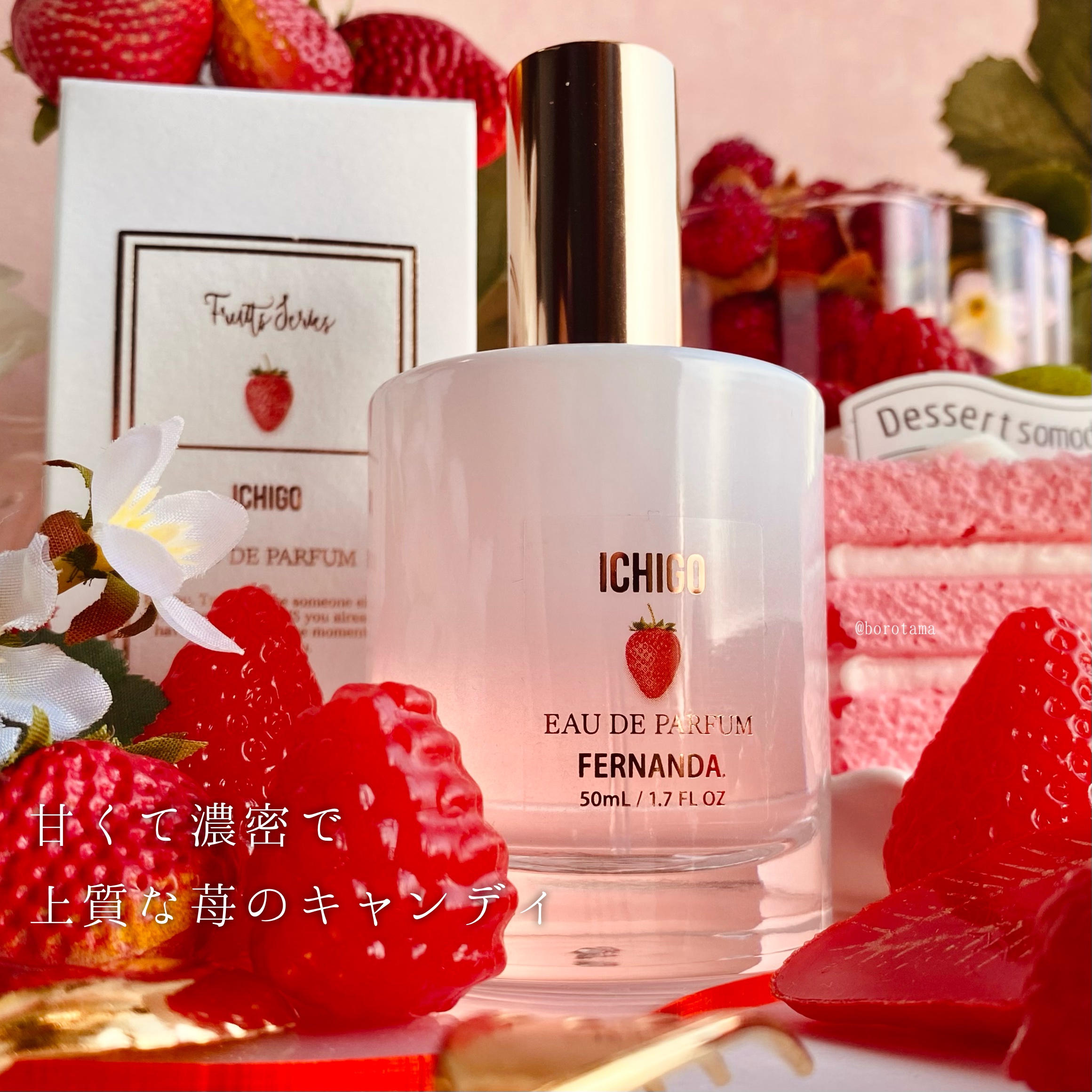 - <直営店舗・公式オンラインストア取扱商品> 〈数量限定〉 甘酸っぱくてジューシーな、摘みたて完熟いちごの香り しっかりとした香り立ちと持続力を兼ね備えた”オードパルファム“。 時間の経過や、肌に馴染むにつれて香りの表情が繊細に変化し、あなたの魅力をそっと引き立てます。 ■香りについて -Ichigo イチゴ- 甘味と酸味のバランスがよい完熟ストロベリーをベースに、みずみずしいリーフィーグリーン、 やさしい甘さのキャンディードストロベリーが重なり合う、摘みたていちごの香り *アップサイクルイチゴエキス配合 (保湿成分) *国産イチゴ果実エキス配合 (天然香料) BLEND:リーフィーグリーン×ストロベリー×キャンディードストロベリー <いちごの王様「あまおう」のロス果実を生かしたサスティナブルフレグランス> 今年もフェルナンダと共同開発を行ったのは、あまおうの産地・福岡県のいちご農園「白木のいちご」。 いちごは栽培に手間がかかる一方で傷つきやすく、ロスが多い果実でもあります。 本コレクションは、そんな市場には出せないいちごの“ロス果実”から抽出した「アップサイクルイチゴ果実エキス*」を配合。(*保湿成分) “あかい、まるい、おおきい、うまい”の頭文字から命名された、いちご界の王様「あまおう」のロス果実を生かしたサスティナブルフレグランスです。 ジューシーで甘酸っぱい、摘みたて完熟いちごの香りをお楽しみください♡