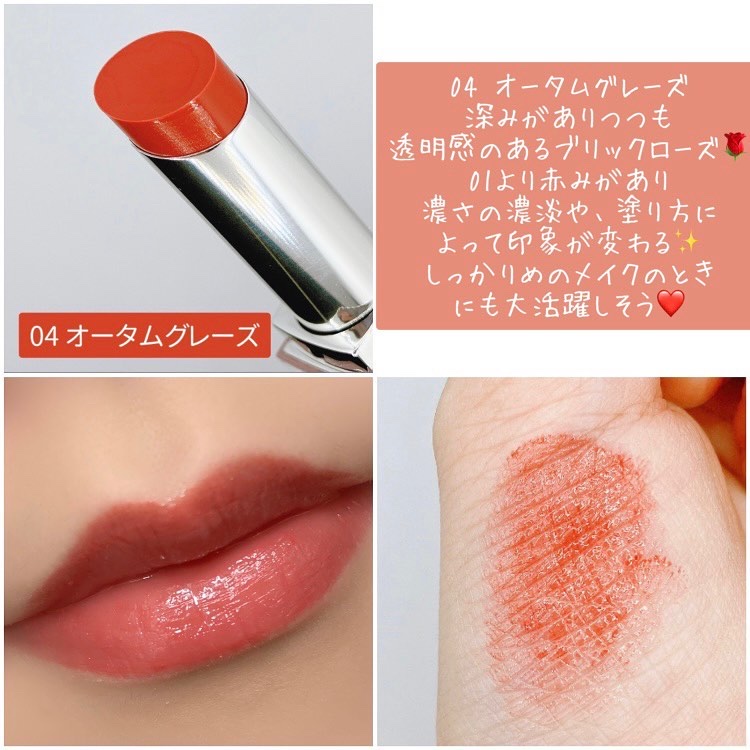 - <01 ミュートパーセント> リンゴ酸ジイソステアリル、ダイマージリノール酸ダイマージリノレイルビス(ベヘニル/イソステアリル/フィトステリル)、ビスジグリセリルポリアシルアジペート 2、デカイソステアリン酸ポリグリセリル 10、トリイソステアリン酸ポリグリセリル 2、水添ポリイソブテン、ジイソステアリン酸ポリグリセリル 3、トリメリト酸トリトリデシル、ダイマージリノール酸ジオクチルドデシル、パラフィン、マイクロクリスタリンワックス、(セバシン酸/イソパルミチン酸)ジグリセリル、酸化チタン、オクチルドデカノール、合成ワックス、黄5、プロパンジオール、赤227、(エチレン/プロピレン)コポリマー、ジステアルジモニウムヘクトライト、香料、酸化鉄、赤202、ジイソステアリン酸ポリグリセリル 2、青1、炭酸プロピレン、水、トコフェロール、BG、1,2 ヘキサンジオール、ココヤシ果実エキス、スイカ果実エキス、グレープフルーツ果実エキス、モモ果実エキス、ザクロ果実エキス、リンゴ果実エキス、エチルヘキシルグリセリン <04 ウォーミングコーラル> ダイマージリノール酸ダイマージリノレイルビス(ベヘニル/イソステアリル/フィトステリル)、リンゴ酸ジイソステアリル、ビスジグリセリルポリアシルアジペート 2、デカイソステアリン酸ポリグリセリル 10、トリイソステアリン酸ポリグリセリル 2、水添ポリイソブテン、ジイソステアリン酸ポリグリセリル 3、トリメリト酸トリトリデシル、ダイマージリノール酸ジオクチルドデシル、パラフィン、マイクロクリスタリンワックス、(セバシン酸/イソパルミチン酸)ジグリセリル、オクチルドデカノール、酸化チタン、合成ワックス、赤104(1)、酸化鉄、黄5、プロパンジオール、黄4、(エチレン/プロピレン)コポリマー、ジステアルジモニウムヘクトライト、香料、ジイソステアリン酸ポリグリセリル 2、炭酸プロピレン、水、トコフェロール、BG、1,2 ヘキサンジオール、ココヤシ果実エキス、スイカ果実エキス、グレープフルーツ果実エキス、モモ果実エキス、ザクロ果実エキス、リンゴ果実エキス、エチルヘキシルグリセリン <07 オータムグレーズ> ダイマージリノール酸ダイマージリノレイルビス(ベヘニル/イソステアリル/フィトステリル)、リンゴ酸ジイソステアリル、ビスジグリセリルポリアシルアジペート-2、デカイソステアリン酸ポリグリセリル-10、トリイソステアリン酸ポリグリセリル-2、水添ポリイソブテン、ジイソステアリン酸ポリグリセリル-3、トリメリト酸トリトリデシル、ダイマージリノール酸ジオクチルドデシル、パラフィン、マイクロクリスタリンワックス、(セバシン酸/イソパルミチン酸)ジグリセリル、オクチルドデカノール、酸化チタン、酸化鉄、合成ワックス、黄5、プロパンジオール、赤202、(エチレン/プロピレン)コポリマー、ジイソステアリン酸ポリグリセリル-2、ジステアルジモニウムヘクトライト、香料、青1、赤227、炭酸プロピレン、水、トコフェロール、BG、1、2-ヘキサンジオール、ココヤシ果実エキス、スイカ果実エキス、グレープフルーツ果実エキス、モモ果実エキス、ザクロ果実エキス、リンゴ果実エキス、エチルヘキシルグリセリン <08 ミューテッドプラム> ダイマージリノール酸ダイマージリノレイルビス(ベヘニル/イソステアリル/フィトステリル)、リンゴ酸ジイソステアリル、ビスジグリセリルポリアシルアジペート 2、デカイソステアリン酸ポリグリセリル 10、トリイソステアリン酸ポリグリセリル 2、水添ポリイソブテン、ジイソステアリン酸ポリグリセリル 3、トリメリト酸トリトリデシル、ダイマージリノール酸ジオクチルドデシル、パラフィン、マイクロクリスタリンワックス、(セバシン酸/イソパルミチン酸)ジグリセリル、オクチルドデカノール、酸化チタン、合成ワックス、酸化鉄、黄5、プロパンジオール、赤202、(エチレン/プロピレン)コポリマー、赤227、ジイソステアリン酸ポリグリセリル 2、ジステアルジモニウムヘクトライト、香料、赤104(1)、青1、炭酸プロピレン、水、トコフェロール、BG、1,2 ヘキサンジオール、ココヤシ果実エキス、スイカ果実エキス、グレープフルーツ果実エキス、モモ果実エキス、ザクロ果実エキス、リンゴ果実エキス、エチルヘキシルグリセリン <09 プラムブリュー> ダイマージリノール酸ダイマージリノレイルビス(ベヘニル/イソステアリル/フィトステリル)、リンゴ酸ジイソステアリル、ビスジグリセリルポリアシルアジペート 2、デカイソステアリン酸ポリグリセリル 10、トリイソステアリン酸ポリグリセリル 2、水添ポリイソブテン、ジイソステアリン酸ポリグリセリル 3、トリメリト酸トリトリデシル、ダイマージリノール酸ジオクチルドデシル、パラフィン、マイクロクリスタリンワックス、(セバシン酸/イソパルミチン酸)ジグリセリル、オクチルドデカノール、酸化チタン、合成ワックス、赤202、プロパンジオール、酸化鉄、黄5、赤227、(エチレン/プ