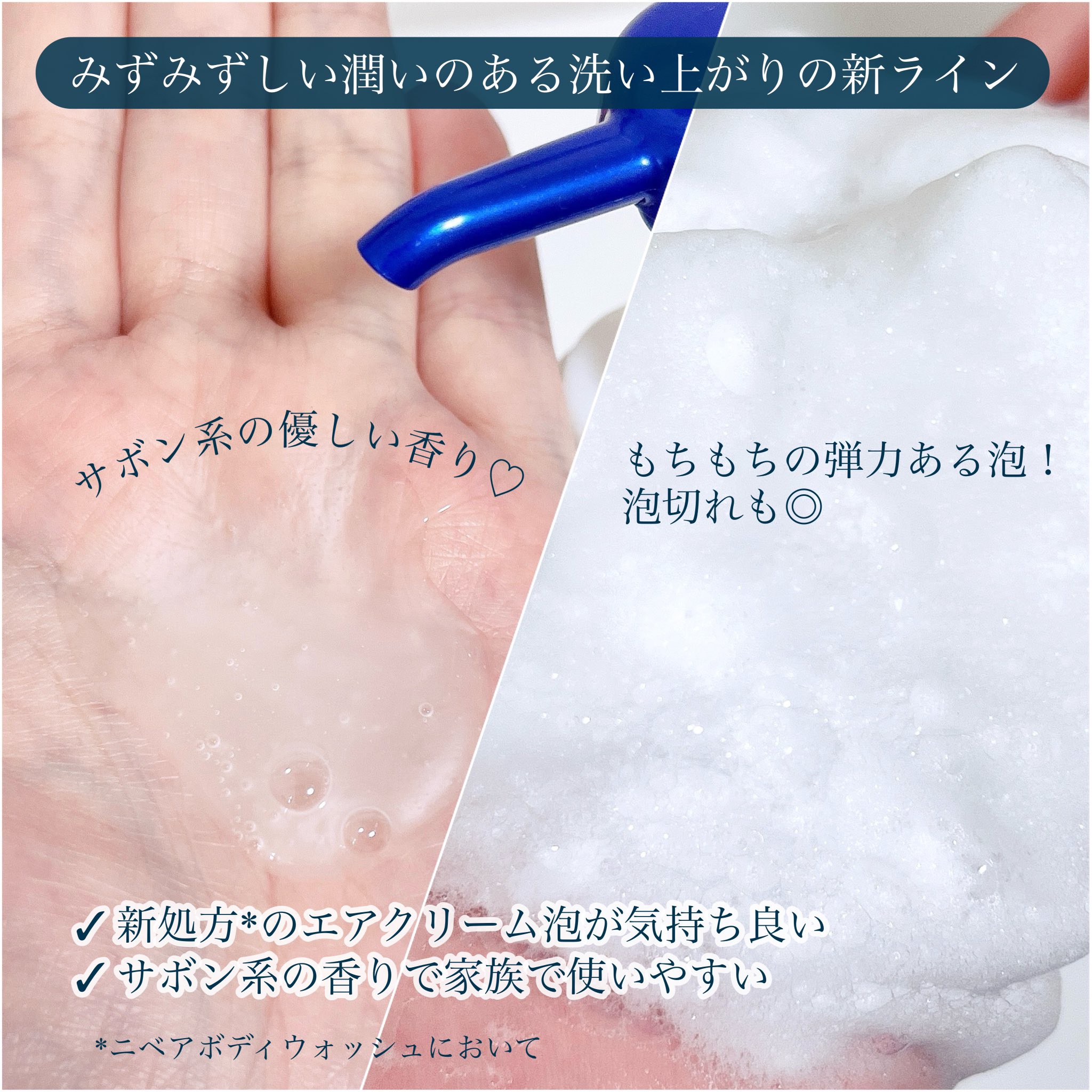 - みずみずしいうるおいのある美肌に洗い上げる“化粧水感覚ボディウォッシュ” リラクシングソープの香り ニベアのスキンケア発想から生まれたW保水美肌*1 処方のボディウォッシュ。 角層保水成分(ヒアルロン酸・コラーゲン)配合:保湿 新処方*2 の素早く泡立つエアリークリーム泡で、肌水分逃さずすっきり洗い、キメの整ったなめらかな美肌に仕上げます。 リラクシングソープの香り、フローラルブーケの香りの2香調 W濃厚保湿*3ライン *1 うるおいを与えキープし美肌に *2 ニベアボディウォッシュにおいて *3 うるおいを与えて、まもる