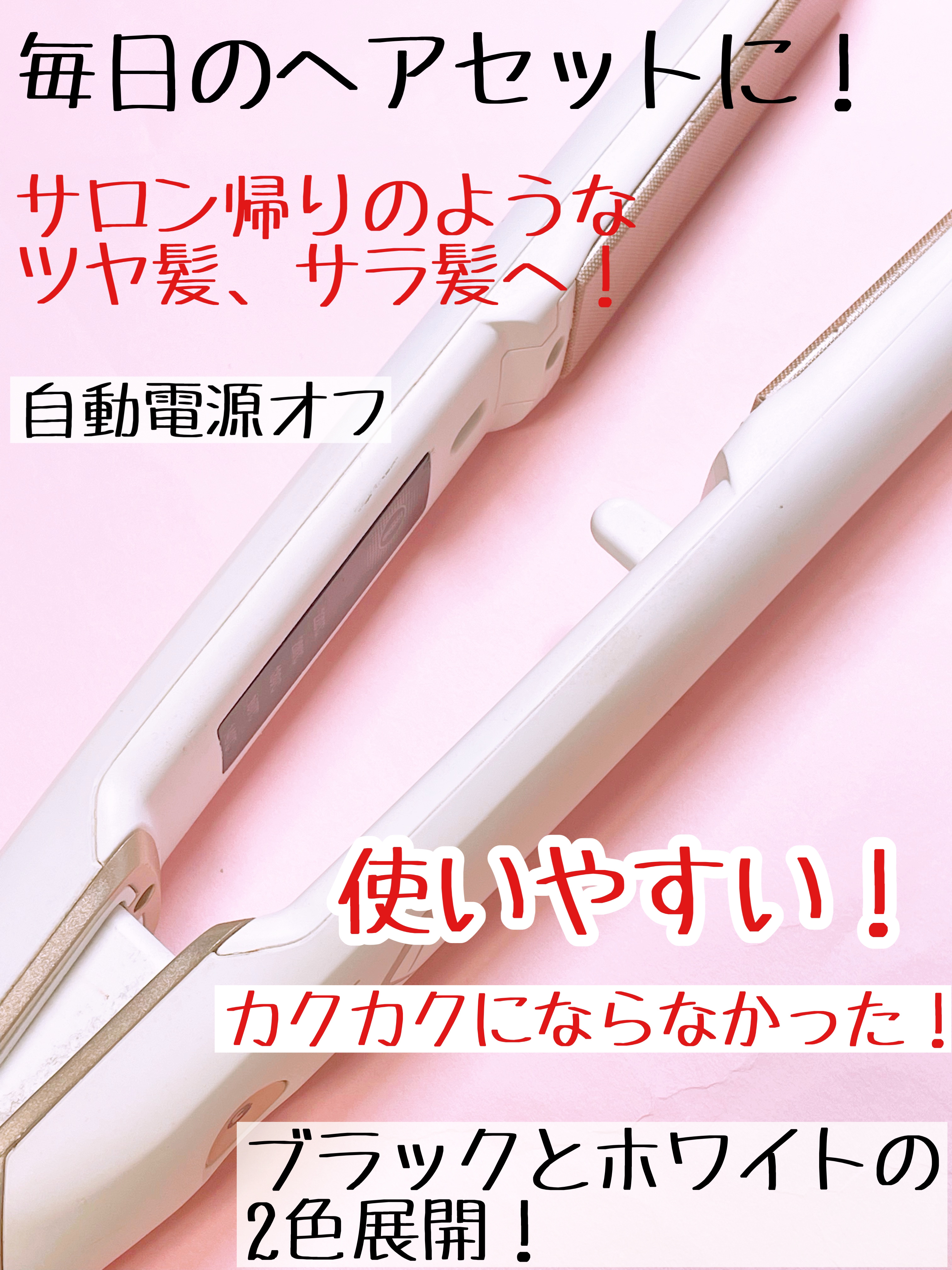 アイロンを通した後の髪の毛のツヤ、柔らかさ、サラサラ具合、そしてストレートの持続具合がめちゃくちゃ良い♡ シルクプレートが採用されてて、挟んでも髪に引っかからないし、摩擦がなくて髪が傷みにくく感じる✨ 180°が20秒だから、スイッチ入れて髪の毛クシでとかしてる間に温まってるの最高👏