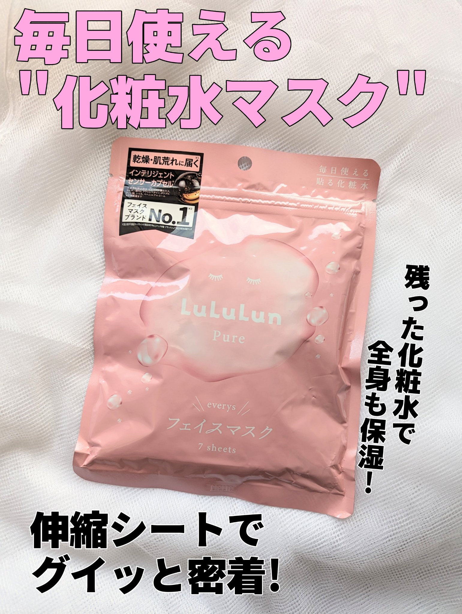 日々の生活で負担をかけてしまったお肌に、たくさんの「幸福感」を届けたくて、「ごきげん」な使い心地にこだわった\ルルルン ピュアエブリーズ/ マシュマロのようにふんわり肌に密着するシート♡ ルルルンの\化粧水フェイスマスク/は、365日朝晩化粧水の代わりに使用できるマスクで、愛用してます♡ ヒタヒタの美容液で、パック後はぷるぷるに潤います♡ 毎日使いたくなるパックです♡