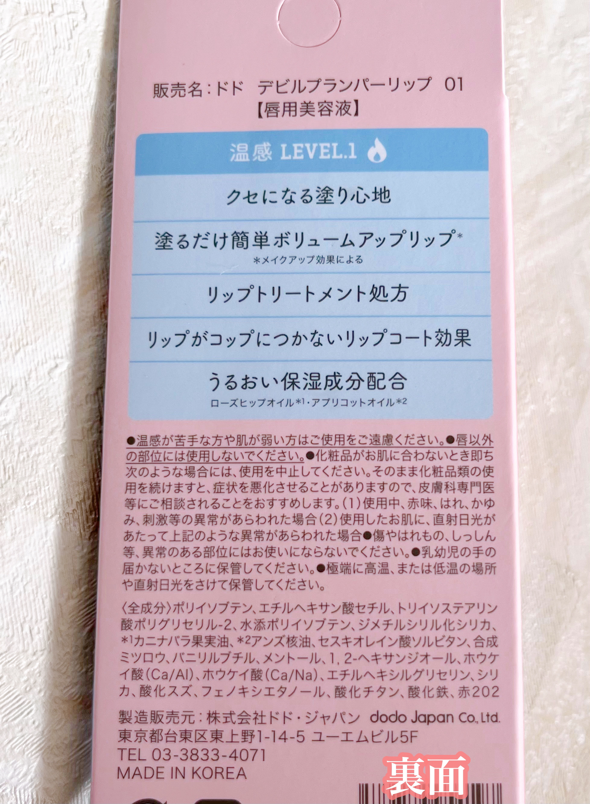 - 韓国でも大人気、塗るだけでぷっくりとしたとした厚みとハリ感を演出するプランパーリップ。 ドドのデビルプランパーリップは、くちびるにむっちりとしたハリ感を与えつつ、クセになるバニリルブチルでジンジンする温感を、メントールでスースーする爽快感を与えます。 レベルが3段階にわかれており、初心者向けから上級者向けの刺激感を与えて楽しめます。 オリジナル水分膜処方で、唇をしっかりコーティングしてくれて、コップへの色うつりも防ぎます。 手持ちのリップの上からの使用も可能で、リップコートとしても使用できます。