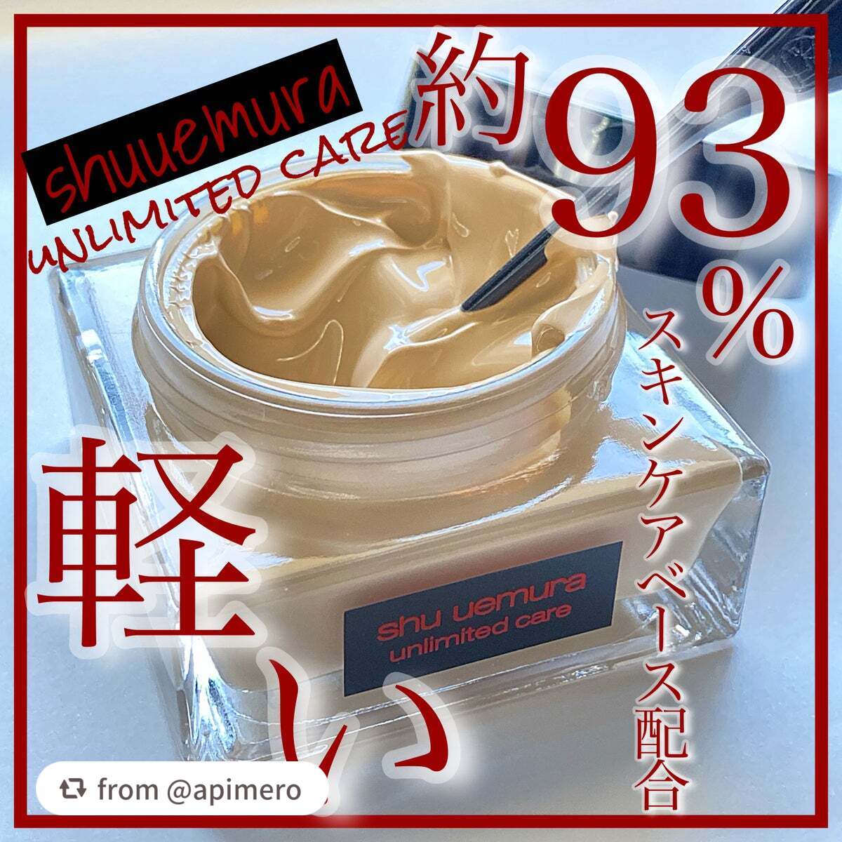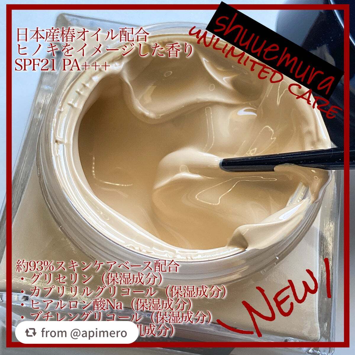 - アンリミテッドケアシリーズ 、新登場。 あなたをそっと包み込む、スキンケアのようなまろやかさ。約93% スキンケアフォーミュラ配合。 まるで美容液のようなケアで、潤い満ちる素肌へ。 一日中*1、内側から溢れるようなツヤで魅せる自信。 *1 シュウ ウエムラ調べ。個人差があります SPF21 PA+++ 1.約 93% スキンケアフォーミュラ配合 乾燥から肌を守るスキンケアフォーミュラ約 93 %配合。独自のなめらかな質感。主なスキンケア成分:日本産椿オイル*、グリセリン** 、カプリリルグリコール **、ヒアルロン酸 Na** 、ブチレングリコール** *ツバキ種子油(整肌成分) **保湿成分として 2.内側から溢れるような艶やかな輝き くすみづらいピグメント配合。みずみずしい素肌のようなうるおい感と、微細な輝きを放つ素肌感のある仕上がり 。 3.心地よい香りとテクスチャー ヒノキのようなリラックス感のある香り。包み込むような心地良いテクスチャー。 4.アジア人の 肌にフォーカスした 全 8 シェード ■発売日 2023年9月13日(水)全国の各店舗にて発売 ※セルフセレクトショップを除く