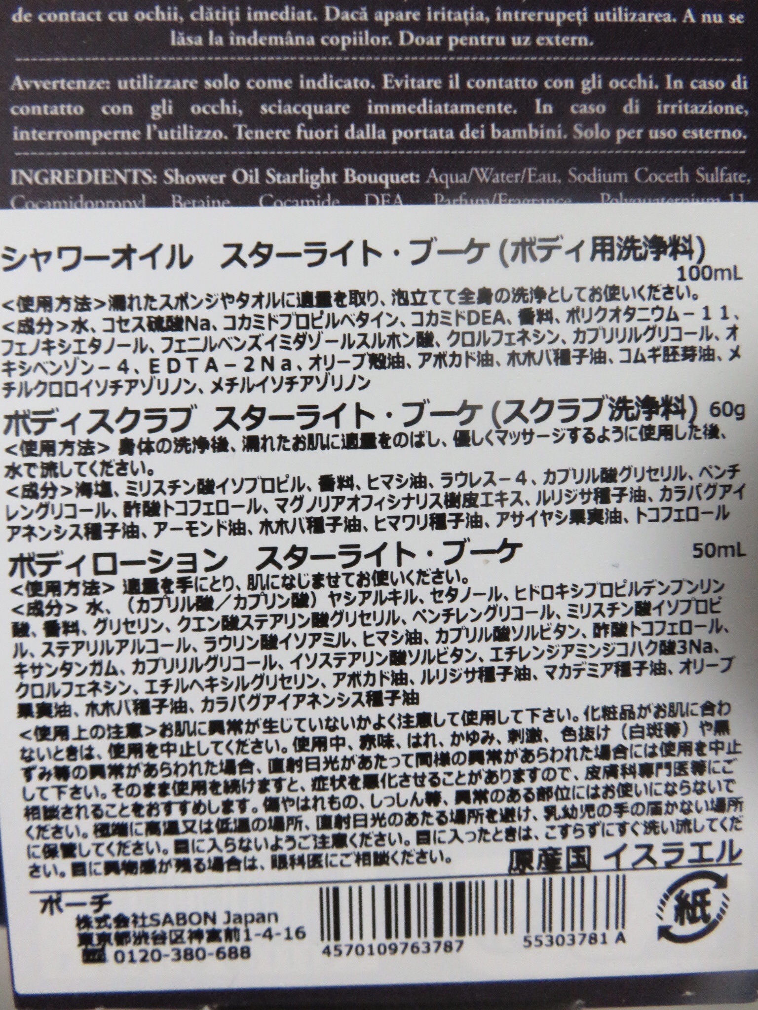 - 〈数量限定〉 〈セット内容〉シャワーオイル スターライト・ブーケ 100mL、ボディスクラブ スターライト・ブーケ 60g、ボディローション スターライト・ブーケ 50mL、ベルベットポーチ