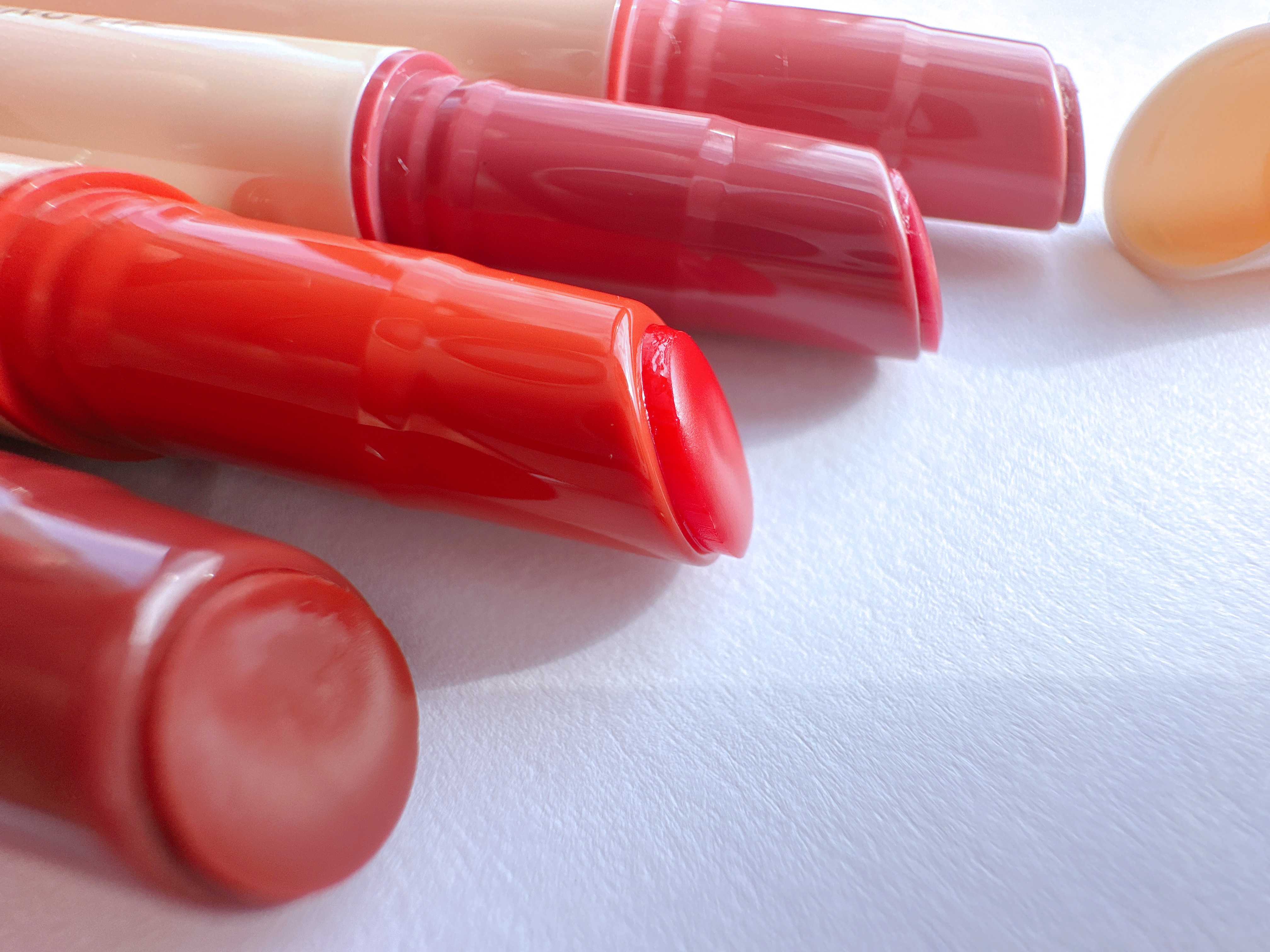 ノック式でカチカチ出すのが楽しい🥰 するするーと体温で溶けるように伸びて塗り心地も良くリップクリームやバームのよう𓈒𓂂𓏸 唇にヴェールを纏うようにツヤツヤ✨ しっとりするけど、嫌なベタつきや重さは少なく◎ 重ねるほど発色するので、薄くもしっかりも発色が調整しやすい☺️