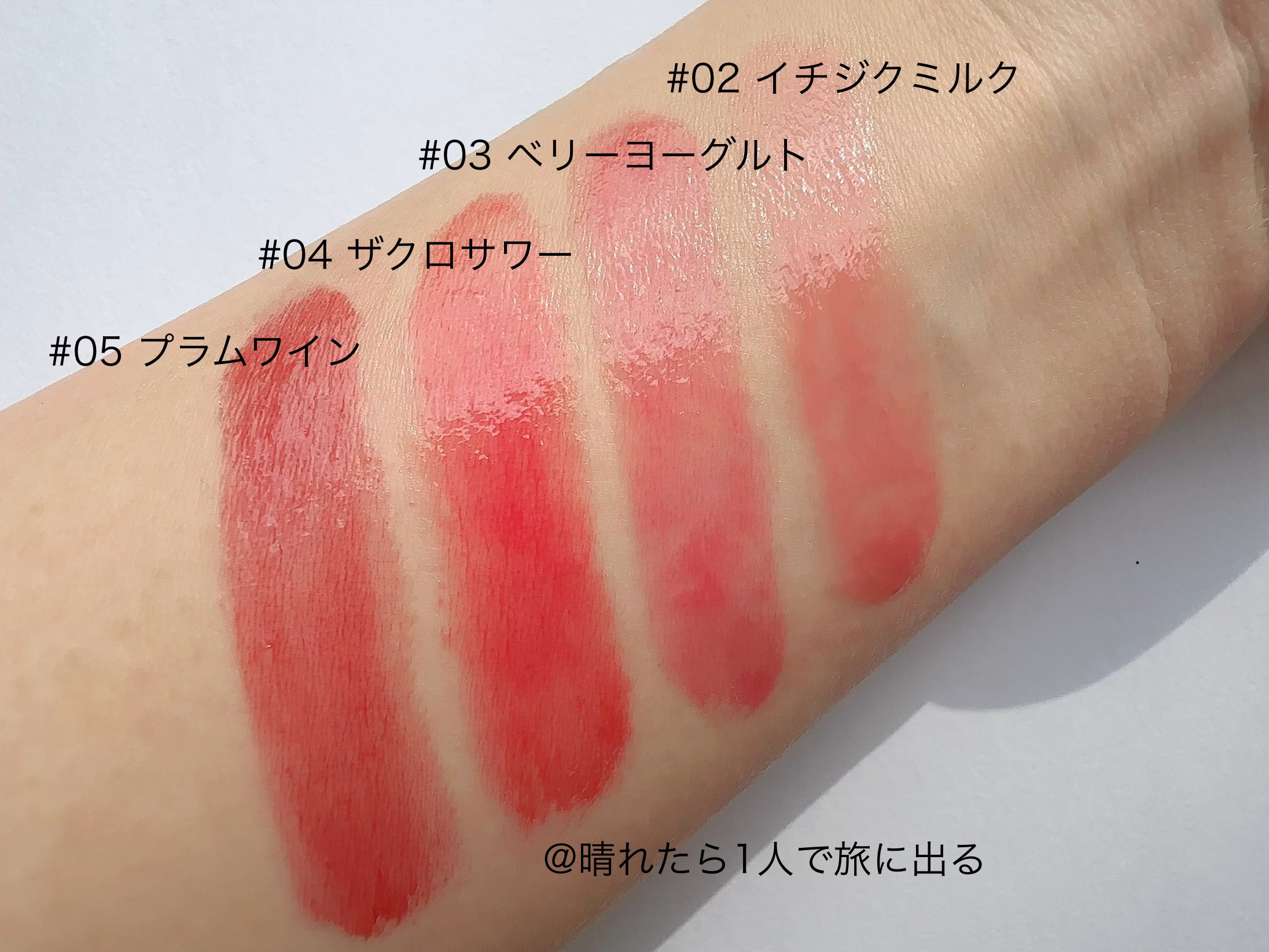 - <01 アプリコットティー> リンゴ酸ジイソステアリル、ダイマージリノール酸ダイマージリノレイルビス(ベヘニル/イソステアリル/フィトステリル)、ビスジグリセリルポリアシルアジペート-2、トリイソステアリン酸ポリグリセリル-2、水添ポリイソブテン、パラフィン、マイクロクリスタリンワックス、ウルシ果皮ロウ、ハチミツエキス、センチフォリアバラ花エキス、マンゴー果実エキス、カニナバラ果実エキス、アーモンド油、アルガニアスピノサ核油、アンズ核油、オリーブ果実油、シア脂、ツバキ種子油、ホホバ種子油、月見草油、BG、トリ(カプリル酸/カプリン酸)グリセリル、1,2-ヘキサンジオール、イソステアリン酸ソルビタン、酢酸トコフェロール、フェノキシエタノール、酸化鉄、酸化チタン、赤202、香料 <02 イチジクミルク> リンゴ酸ジイソステアリル、ダイマージリノール酸ダイマージリノレイルビス(ベヘニル/イソステアリル/フィトステリル)、ビスジグリセリルポリアシルアジペート-2、トリイソステアリン酸ポリグリセリル-2、水添ポリイソブテン、パラフィン、マイクロクリスタリンワックス、ウルシ果皮ロウ、ハチミツエキス、センチフォリアバラ花エキス、マンゴー果実エキス、カニナバラ果実エキス、アーモンド油、アルガニアスピノサ核油、シア脂、オリーブ果実油、アンズ核油、ツバキ種子油、ホホバ種子油、月見草油、BG、トリ(カプリル酸/カプリン酸)グリセリル、1,2-ヘキサンジオール、イソステアリン酸ソルビタン、酢酸トコフェロール、フェノキシエタノール、酸化鉄、酸化チタン、赤202、青1、香料 <03 ベリーヨーグルト> リンゴ酸ジイソステアリル、ダイマージリノール酸ダイマージリノレイルビス(ベヘニル/イソステアリル/フィトステリル)、ビスジグリセリルポリアシルアジペート-2、トリイソステアリン酸ポリグリセリル-2、水添ポリイソブテン、パラフィン、マイクロクリスタリンワックス、ウルシ果皮ロウ、ハチミツエキス、センチフォリアバラ花エキス、マンゴー果実エキス、カニナバラ果実エキス、アーモンド油、アルガニアスピノサ核油、シア脂、オリーブ果実油、アンズ核油、ツバキ種子油、ホホバ種子油、月見草油、BG、トリ(カプリル酸/カプリン酸)グリセリル、1,2-ヘキサンジオール、イソステアリン酸ソルビタン、酢酸トコフェロール、フェノキシエタノール、酸化鉄、酸化チタン、赤202、黄5、香料 <04 ザクロサワー> リンゴ酸ジイソステアリル、ダイマージリノール酸ダイマージリノレイルビス(ベヘニル/イソステアリル/フィトステリル)、ビスジグリセリルポリアシルアジペート-2、トリイソステアリン酸ポリグリセリル-2、水添ポリイソブテン、パラフィン、マイクロクリスタリンワックス、ウルシ果皮ロウ、ハチミツエキス、センチフォリアバラ花エキス、マンゴー果実エキス、カニナバラ果実エキス、アーモンド油、アルガニアスピノサ核油、シア脂、オリーブ果実油、アンズ核油、ツバキ種子油、ホホバ種子油、月見草油、BG、トリ(カプリル酸/カプリン酸)グリセリル、1,2-ヘキサンジオール、イソステアリン酸ソルビタン、酢酸トコフェロール、フェノキシエタノール、黄5、赤202、香料 <05 プラムワイン> リンゴ酸ジイソステアリル、ダイマージリノール酸ダイマージリノレイルビス(ベヘニル/イソステアリル/フィトステリル)、ビスジグリセリルポリアシルアジペート-2、トリイソステアリン酸ポリグリセリル-2、水添ポリイソブテン、パラフィン、マイクロクリスタリンワックス、ウルシ果皮ロウ、ハチミツエキス、センチフォリアバラ花エキス、マンゴー果実エキス、カニナバラ果実エキス、アーモンド油、アルガニアスピノサ核油、シア脂、オリーブ果実油、アンズ核油、ツバキ種子油、ホホバ種子油、月見草油、BG、トリ(カプリル酸/カプリン酸)グリセリル、1,2-ヘキサンジオール、イソステアリン酸ソルビタン、酢酸トコフェロール、フェノキシエタノール、酸化鉄、赤202、青1、香料 <06 チャイミルクティー> リンゴ酸ジイソステアリル、ダイマージリノール酸ダイマージリノレイルビス(ベヘニル/イソステアリル/フィトステリル)、ビスジグリセリルポリアシルアジペート-2、トリイソステアリン酸ポリグリセリル-2、水添ポリイソブテン、パラフィン、マイクロクリスタリンワックス、ハチミツエキス、センチフォリアバラ花エキス、マンゴー果実エキス、カニナバラ果実エキス、アーモンド油、アルガニアスピノサ核油、シア脂、オリーブ果実油、アンズ核油、ツバキ種子油、ホホバ種子油、月見草油、BG、トリ(カプリル酸/カプリン酸)グリセリル、水、1,2-ヘキサンジオール、イソステアリン酸ソルビタン、BHT、酢酸トコフェロール、フェノキシエタノール、酸化チタン、酸化鉄、香料 <21 ダーティチョコ> リンゴ酸ジイソステアリル、ダイマージリノール酸ダイマージリノレイルビス(ベヘニル/イソステアリル/フィトステリル)、ビスジグリセリルポリアシル