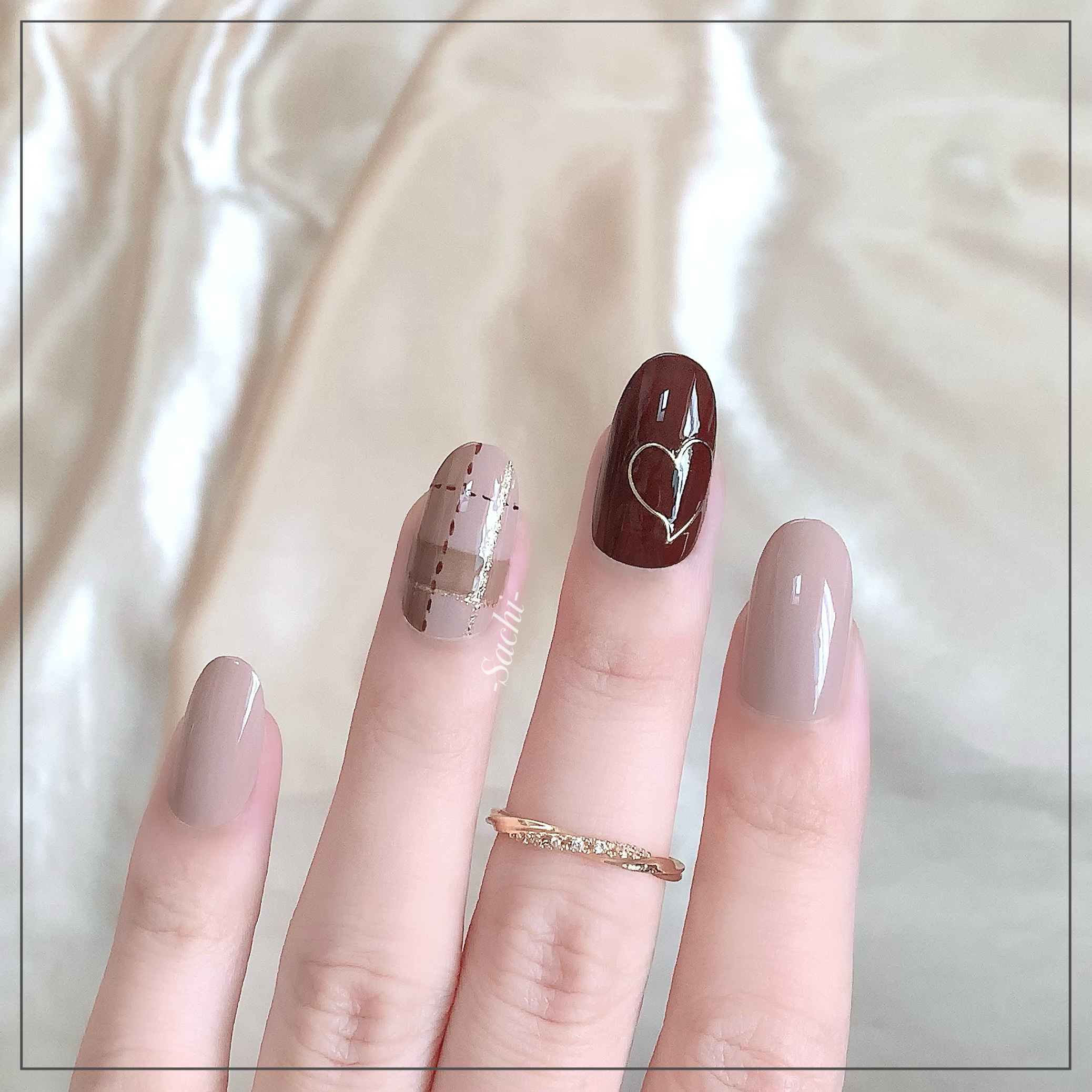 ワンカラーでも指ごとに色を変えるだけでオシャレに見えます💕 画像のようにゴールドラインとストーンを少し足すだけで華やかさがアップ🥰 何度かご紹介したことのあるスポンジで作るグラデーションです✨ スポンジを使うことで境目が綺麗に馴染んでくれます💕 アルミホイルの上でブラウンとトップコートを1:1くらいで混ぜたものを、トップコートのハケに取って3箇所に塗るだけ👌 事前に混ぜたものを塗ることで、爪の上でぼかすより簡単に出来ます💕 ベースカラーが乾く前に点置きしてぼかすことで綺麗にぼかせます✨ スピードが大事なので、使うポリッシュのキャップは全て開けておきましょう😊 天然石のラインはガタガタの方がより天然石っぽく見えるので、ラインを描くのが苦手な方でも大丈夫🙆♀️ 難しそうに見えて、やってみると意外と簡単に出来ます♡