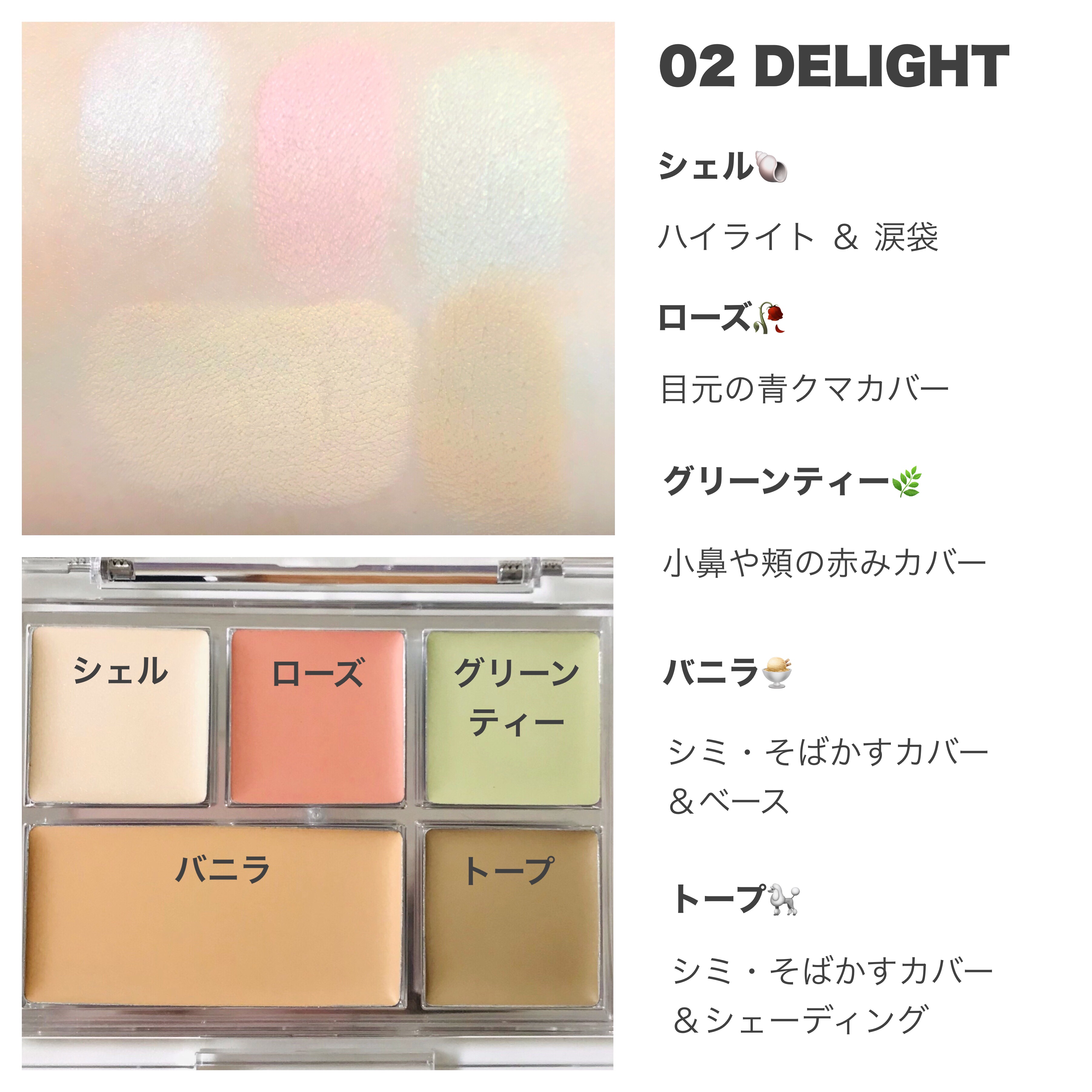 コレクティングとコンシーラーが一緒に構成されたパレットで完成度の高いベースメイクアップを。 体温でふわっととろけるようなクリーミーなテクスチャーがお肌になめらかに密着し、長時間美しい仕上がりをキープします。 このパレット1つですべてカバーできるのが嬉しい♡