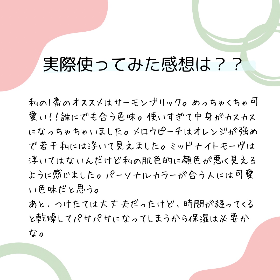 | 口紅・グロス・リップライナーランキング第11位 | すっごいみずみずしい🤩アプリケーターの角度も凄く塗りやすい🥰 | 詳細を見る | |