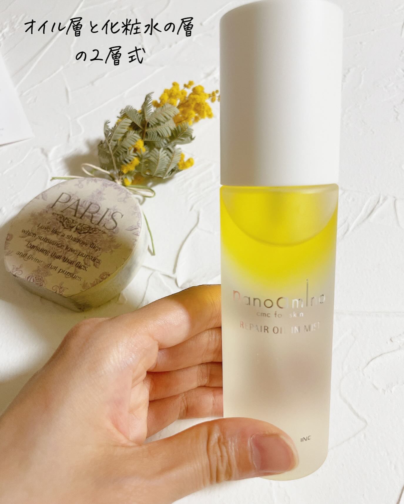 オイル層で肌をやわらかく整え、化粧水層でみずみずしいうるおい補給できる2層式ミスト✨ 奇跡のオイルと言われるホホバオイルのおかげで、しっとりした保湿感が今の時期にピッタリ♪ ビタミンCの172倍の美肌効果があると言われるフラーレン&キュアパッション配合だから、むくみ防止にも良いらしい🥰