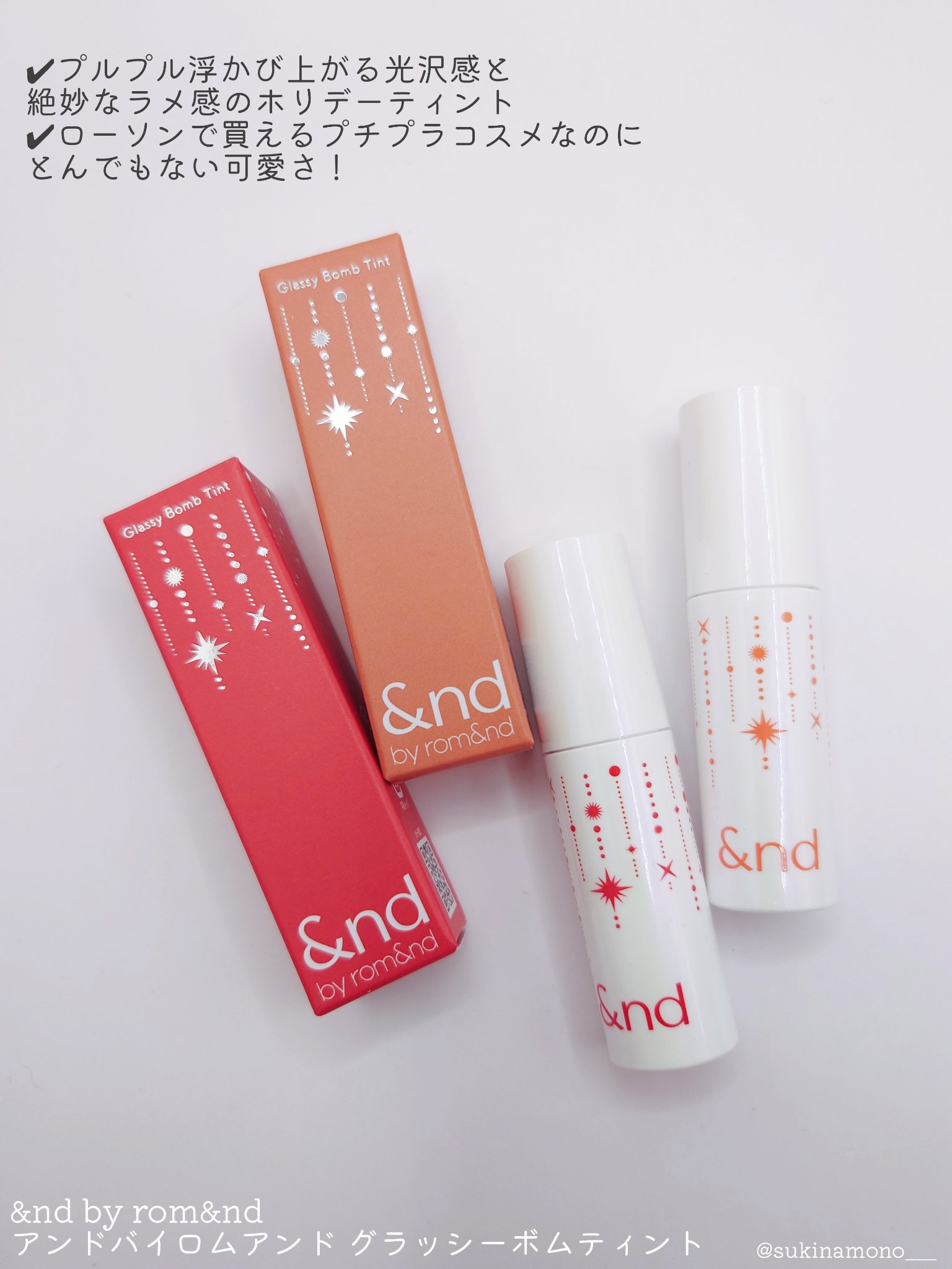 アンドバイロムアンドのグラッシーボムティントから、ホリデーシーズン限定カラーが出ました🥺✨ ぷるつやでとってもかわいいリップシリーズ😍!なんとローソンで販売しています(๑•̀ㅂ•́)و✧ ロムアンドの大人気リップの品質をそのままに、持ち運びしやすいサイズも最高です👍🏻✨ プリンのようなぷるぷる光沢感が魅力的なリップティントで、うるうる感がちょうど良くて、限定カラーが発売されるのも楽しみなシリーズです(*˘︶˘*).。.:*♡