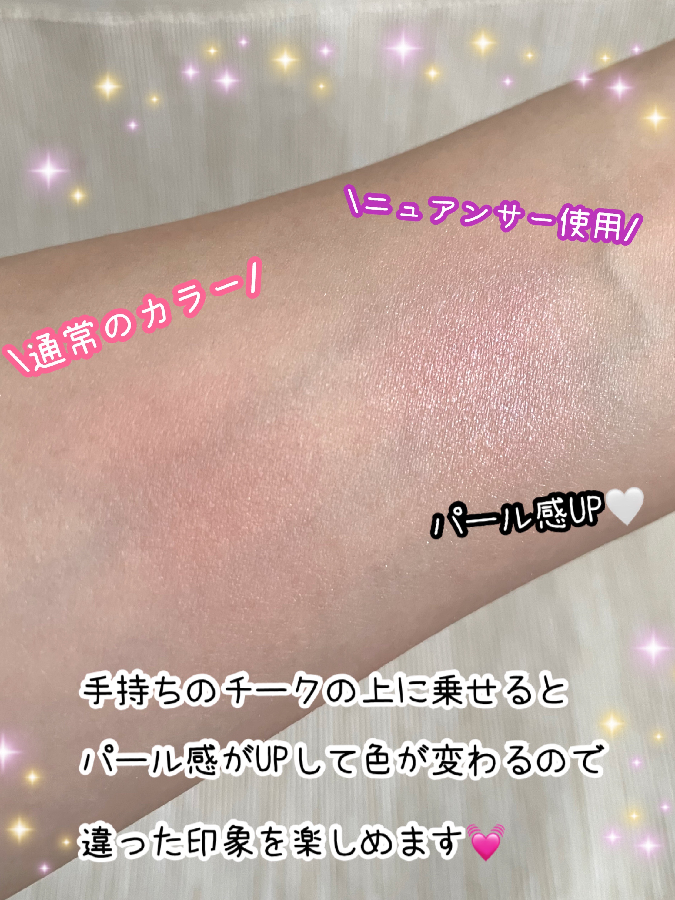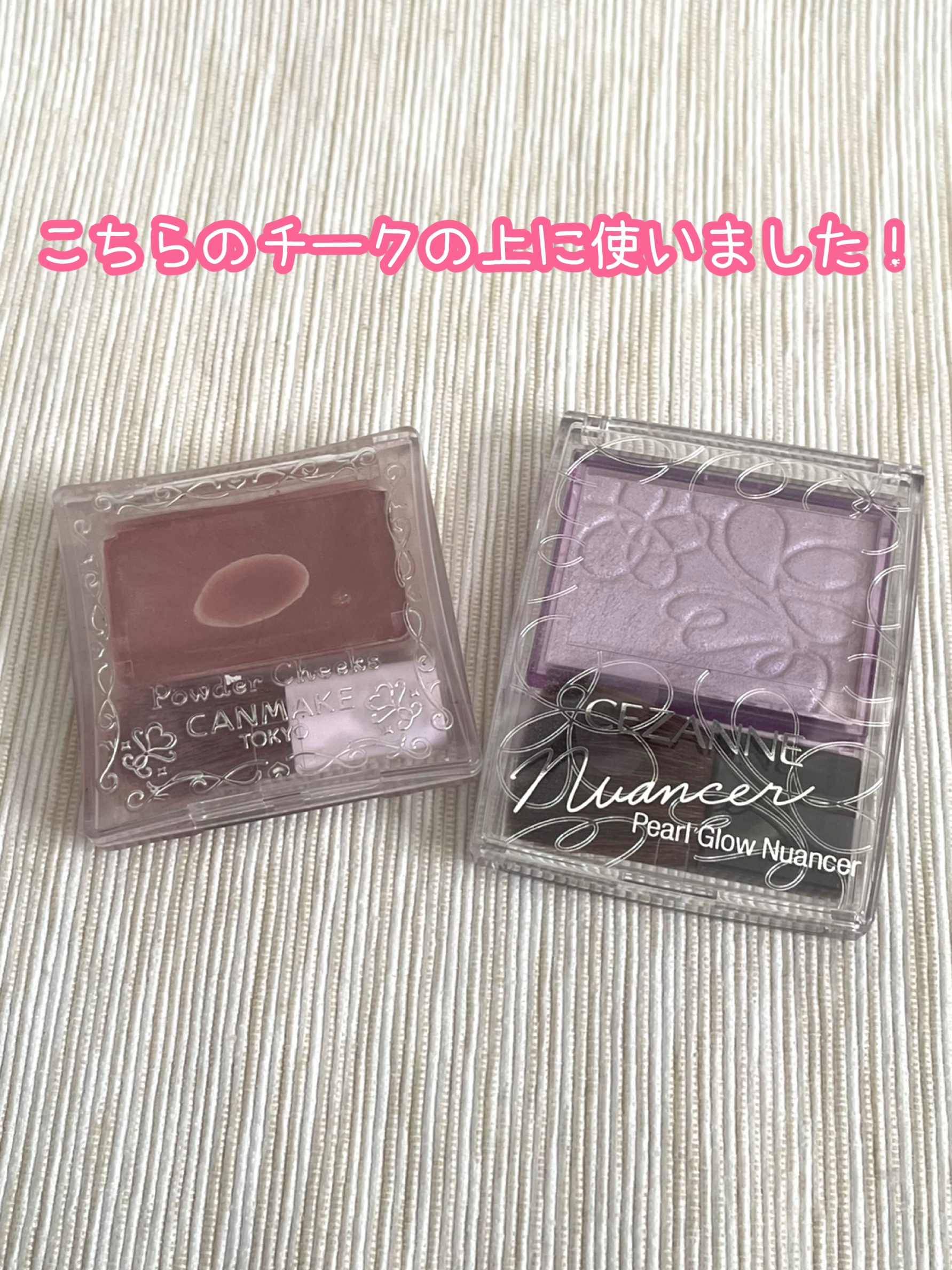 透明感あふれるライラックカラーの輝きをふんわり足してくれるニュアンサー✨ 色味も輝きも強すぎないのでどんなチークとも合わせやすいと思います スウォッチは付属のブラシで塗りました 動画は照明の当たる所で撮影しました