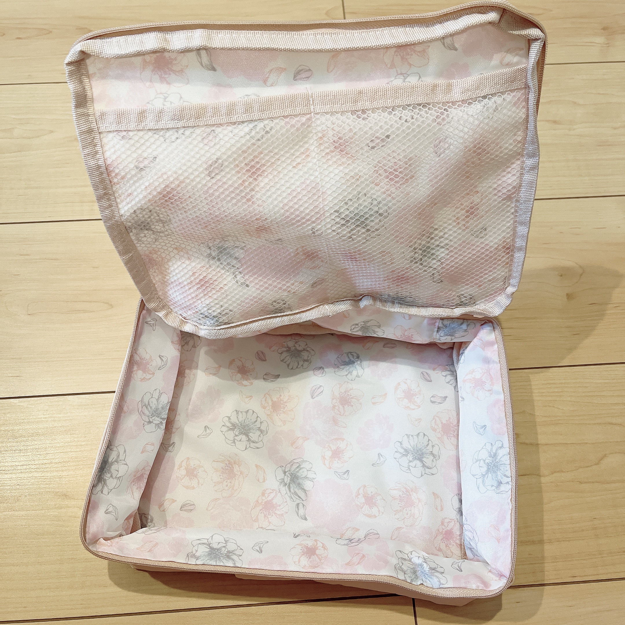 中にシャントリ入れてもまだ余裕あるぐらい大きくて、お出かけや旅行にも持っていけそうなサイズ感💡 チャックで開閉・蓋部分には仕切り付きのメッシュが付いてるから、そこにブラシを入れたりもできるよ❣️ 持ち手も付いてるから、急いでる時にコスメ放り込んでも◎