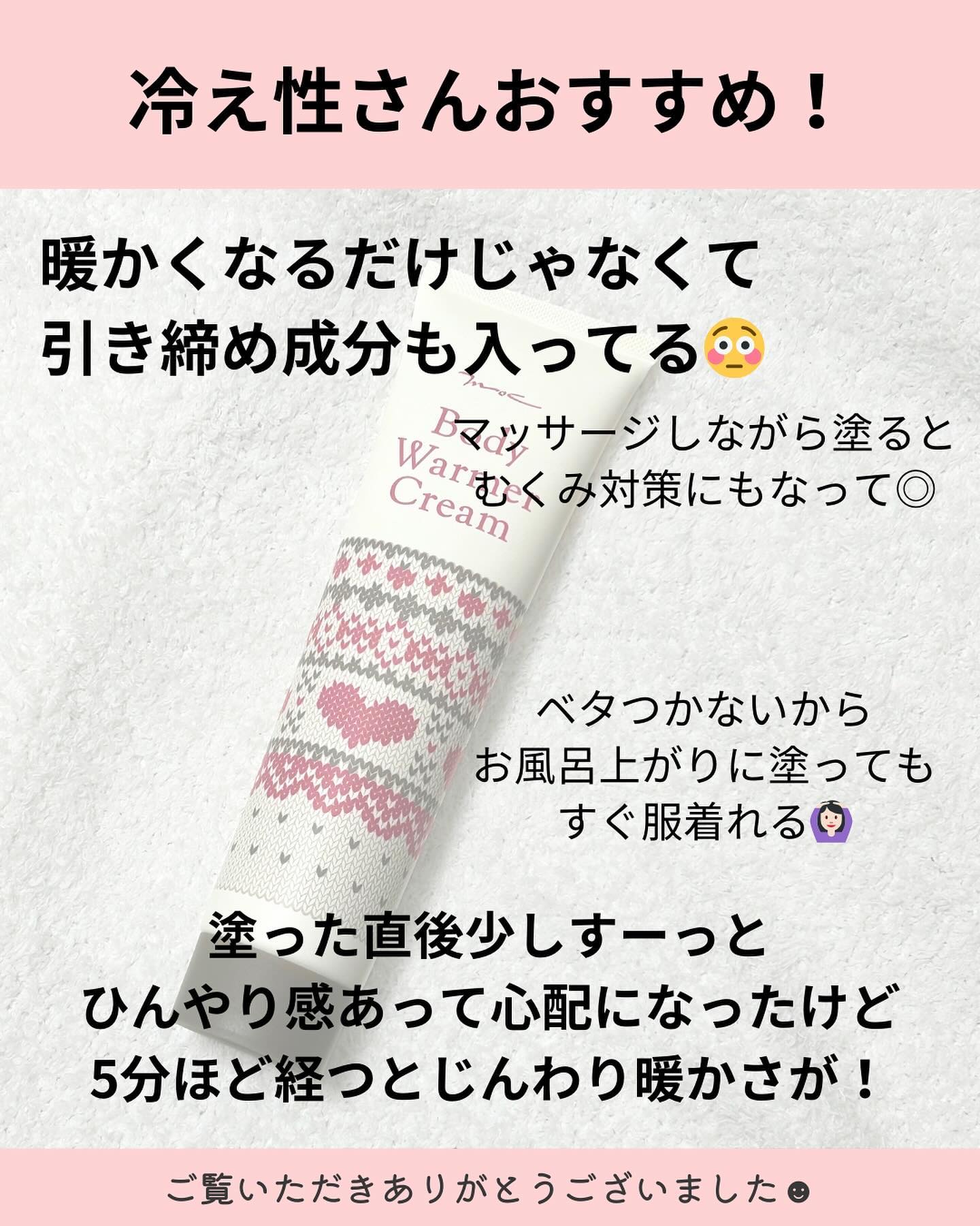 じんわり、ジワ〜と暖かくなるぽかぽか温感!! じんわりあったか ”塗るニット”だよ!🥹 お肌をすっきり引き締める&うるおいのベールで肌をなめらかに! 本当に普通のボディークリームのように体に塗ってあげることでじんわり暖かくなる!! これは試してみないと分からないと思うから本当に試してみて欲しい!!🧡