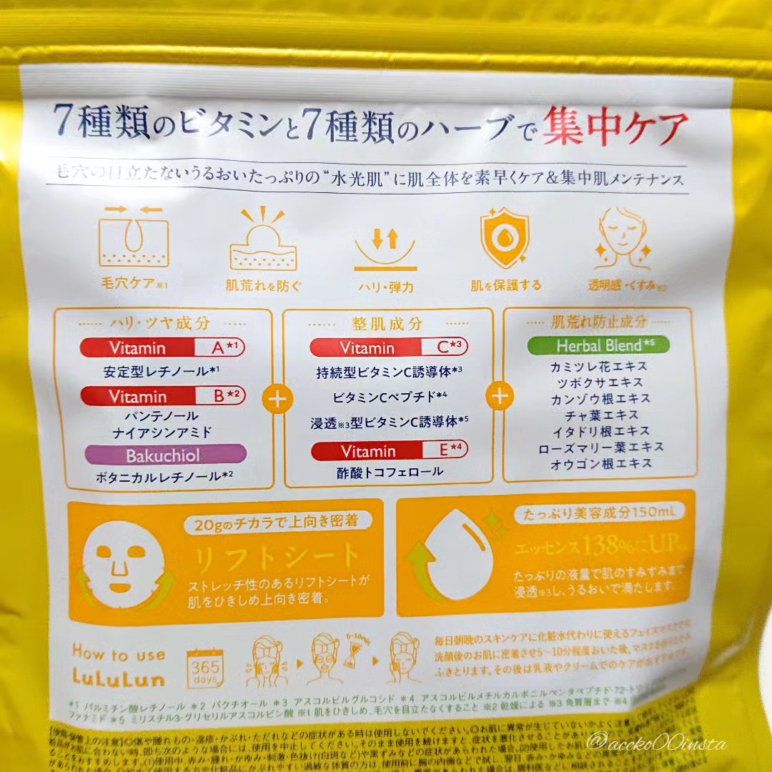 - ルルルンからビタミンたっぷりの化粧水フェイスマスクが新登場。 7種類のビタミン※1と7種類のハーブ※1で肌全体を素早くケア&集中肌メンテナンス。 新開発のフェイスラインに密着するシートで肌を引き締めながら肌のすみずみ※2までうるおいで満たし、毛穴の目立たないうるおいたっぷりの“水光肌”へ。 (※1 全て保湿成分として ※2 角質層まで)