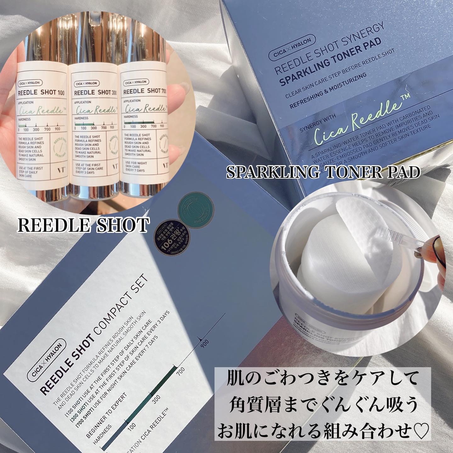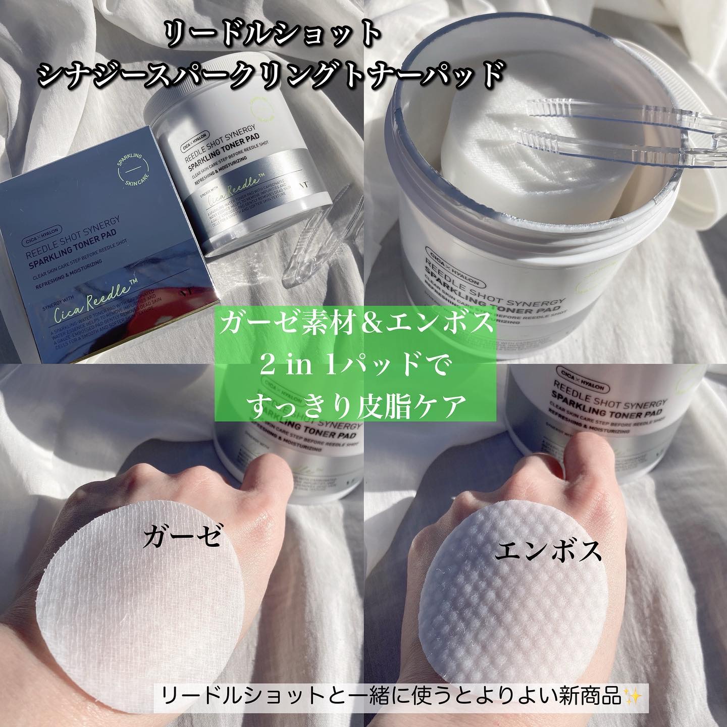 リードルショット🥳 大話題のダーマペン美容液、 美容成分の吸収を手伝うスキンブースター✨ CICA成分が配合された美容針が道を作り、 角質層まで届ける☺️🤍🤍 リードルショットを初めて使う人におすすめ😆 1つ1つもコンパクトなので、 旅行に持って行くにも良さそう👜 リードルショット💚 テクスチャーはなめらか😊 そしてチクチク…🥹✨ リードルショット300:3日1回使用で届けるケア リードルショット700:7日1回使用でスペシャルケア リードルショット シナジー スパークリングトナーパッドは 初めて使ってみたけど、これ良い〜😳🤍🤍 ガーゼ面で拭き取ってから、エンボス面で 拭き取って使うタイプだよ❗️ イタリアのアルプス山脈700M地下から 沸き上がった鉱泉水でマグネシウム、 硫酸塩などのミネラルがバランスよく含み 素肌バランスを整え、 毛穴の老廃物をスッキリ落とし 角質ケアをサポートしてくれる✨ この組み合わせすごい☺️❤️❤️ セットで使うの病みつきです✨