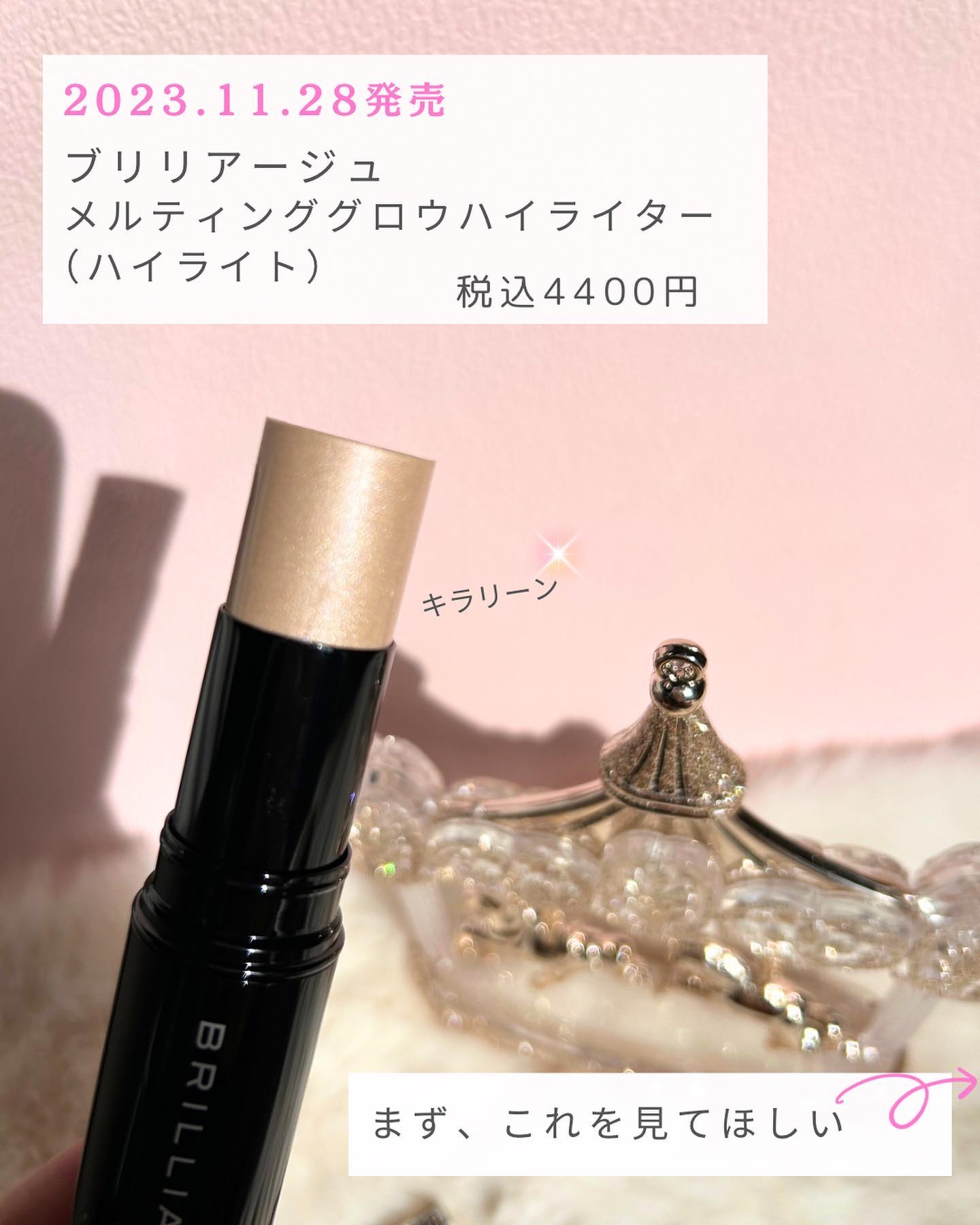 BRILLIAGEMELTINGGLOWHIGHLIGHTERPINKNOUVEAUじゅわっと肌に溶け込むようなテクスチャで肌にツヤ感とぬれ感を与えてくれる✨ヌーディピンクカラーで肌馴染みが良く、ギラギラと言うよりは上品なツヤ感でベースがヨレ...
