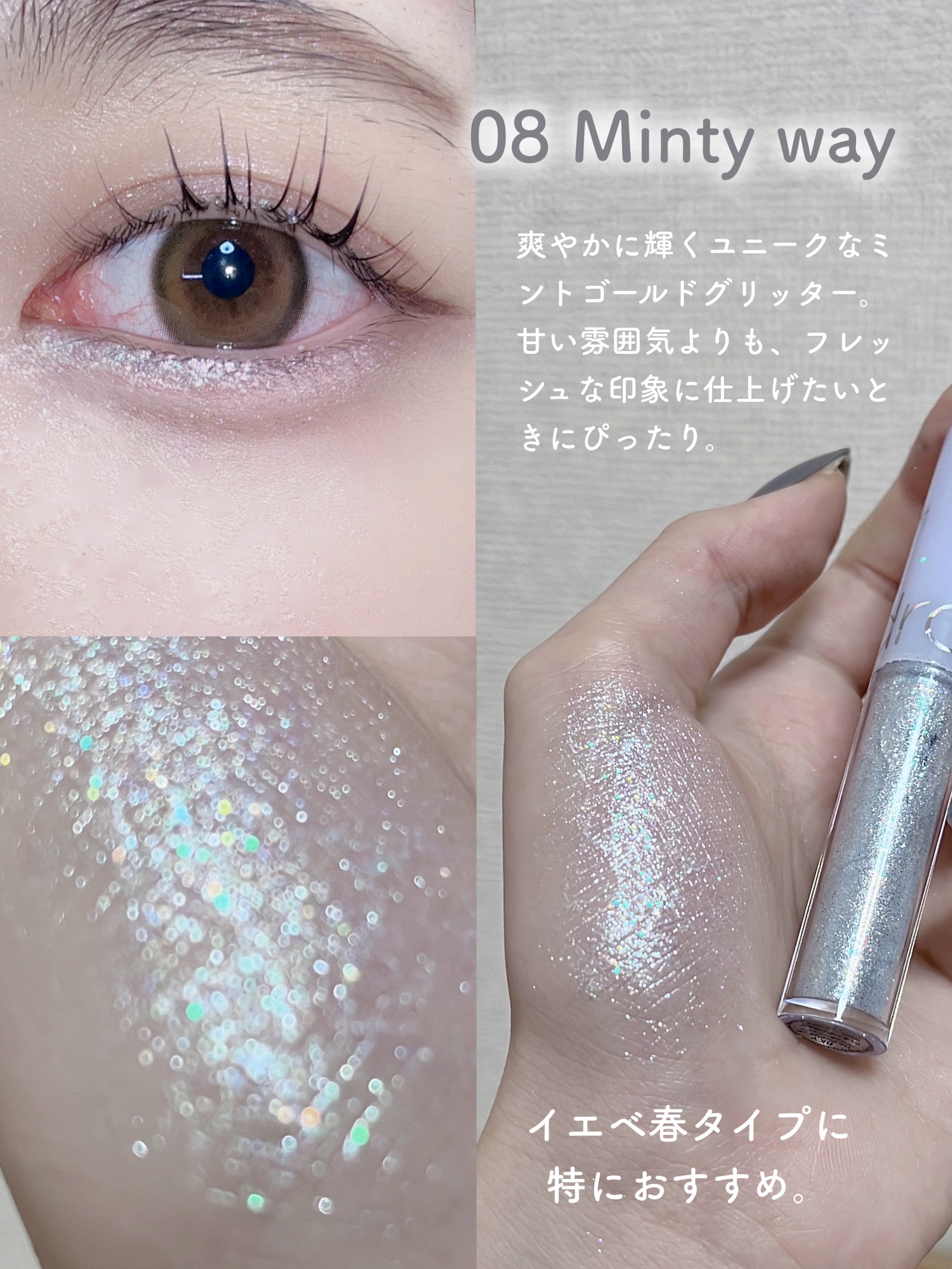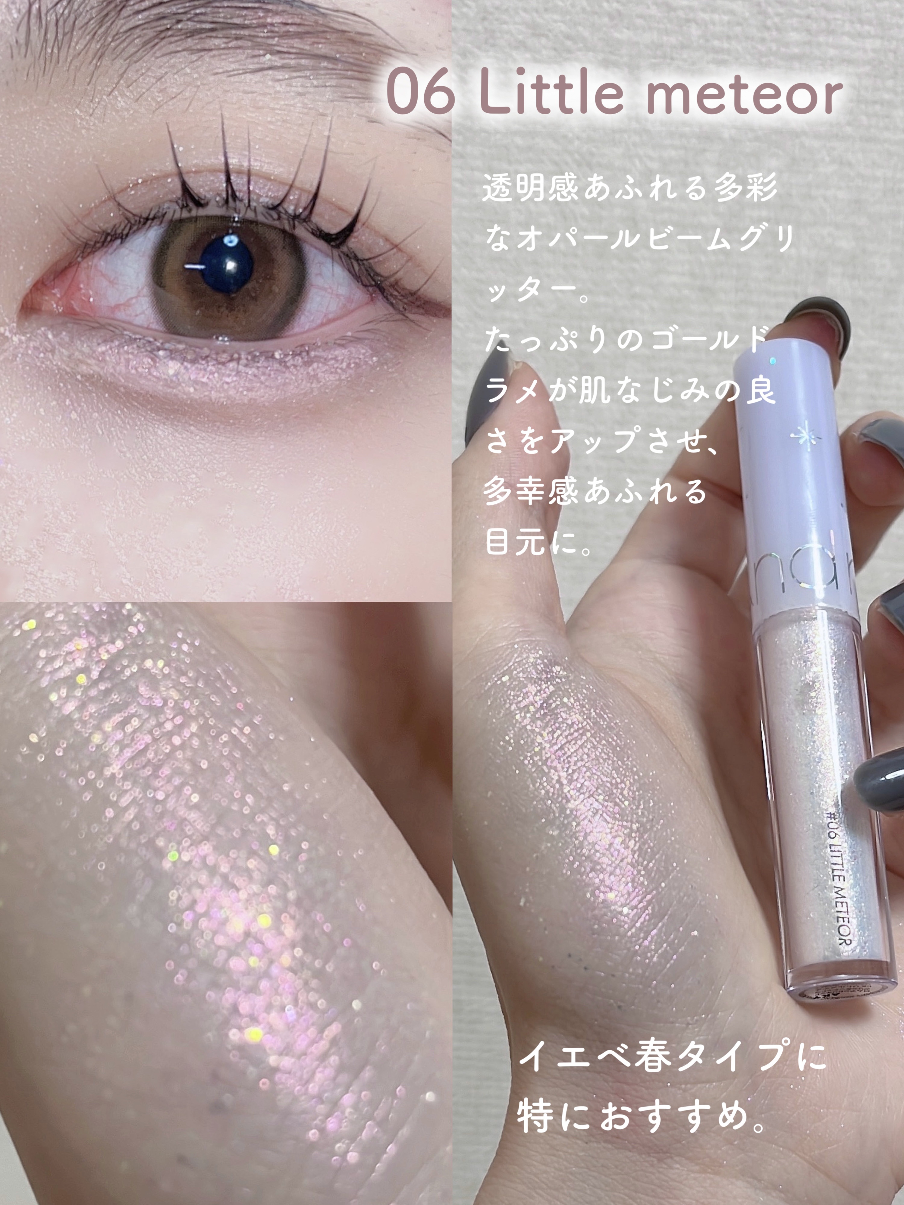 - ココロ踊るプリズムアイ ①様々な粒子を黄金比率で構成 ②長時間輝きを維持 ③使いやすい弾力のあるチップ <05~08> rom&ndが「ジューシーラスティングティント」に次いで日本へ展開したアイテムのひとつである「リキッドグリッターシャドウ」。 発売以来、160万本(*1)を超える実績を持つ定番人気商品ですが、このたび新たに4色を発売します。 既存カラーと比較すると、ラメはより繊細に、色味も淡めのニュアンスカラーになりました。 冬の空にかかるオーロラのように、多彩な表情を目もとにプラスします。 既存カラーと合わせて全8色、その日のメイクに合わせてお選びいただけます。 *1…2020年4月~2023年11月の出荷本数(当社データより)