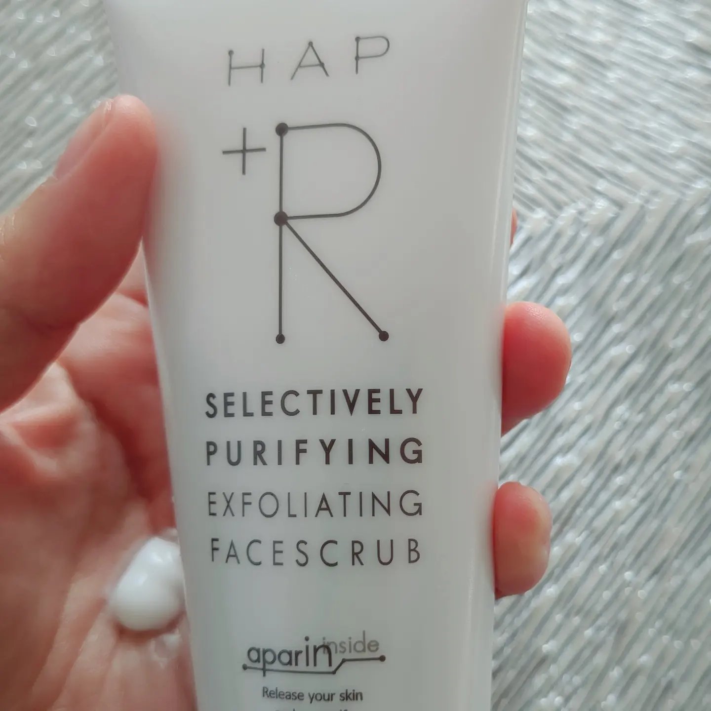 ハップアールのスクラブ粒子(スキンケア用アパタイト)は「悪玉皮脂」を選んで吸着、「善玉皮脂」は残すからさっぱり・つるつるなのにうるおいが残るそう! フェイススクラブら「@cosmeベストコスメアワード2024年ベストゴマージュ・ピーリング部門第2位」!!だそう はっきり見えるスクラブ粒子。スクラブがしっかりコロコロしてるので優しく馴染ませてます。