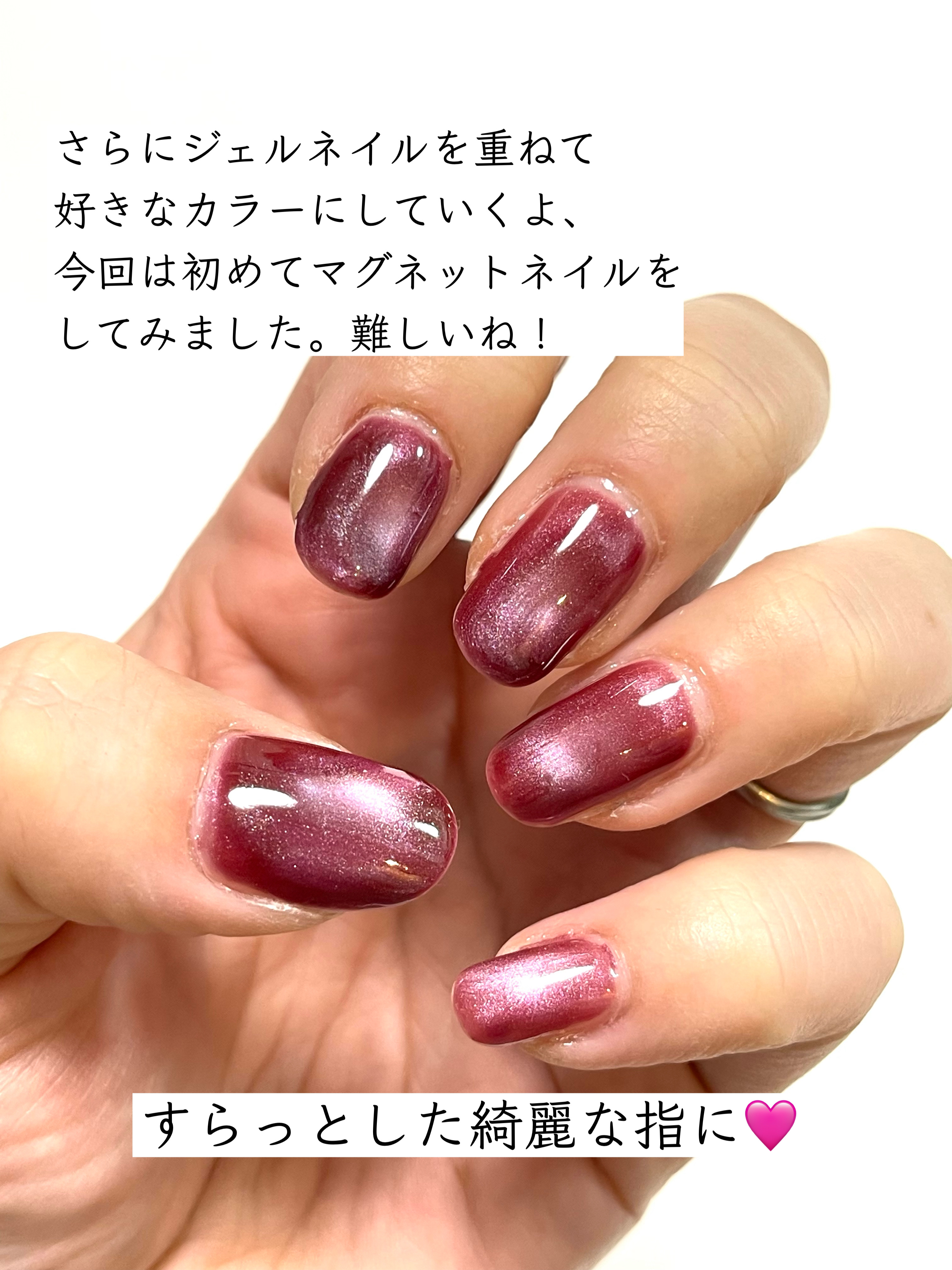 初めて長さ出しをやってみましたが、 チップにジェルを塗り広げる時に、ブラシにジェルがくっ付いてチップに付きにくかったのでめっちゃ使いづらかったです。 こちらのカラーは肌馴染みの良いピンクで、派手にしたくない時やオフィスで仕事される方や初心者はすごく使いやすいかと思います! こちらのマグネットネイルはすごく気に入りました! また他の色も集めたいと思います!