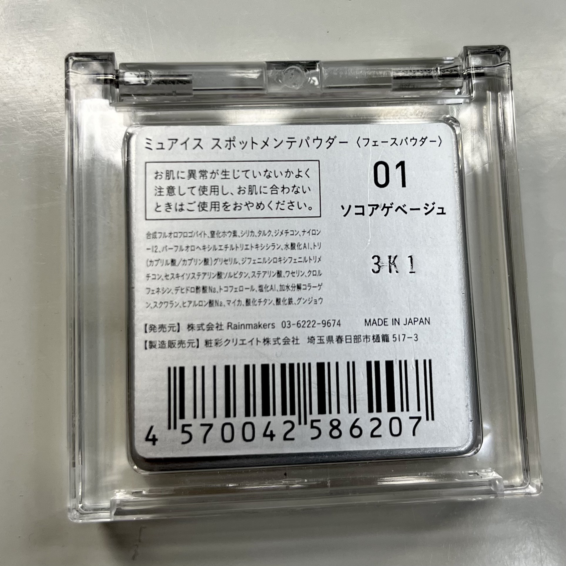 - <01 ソコアゲベージュ> 合成フルオロフロゴパイト、窒化ホウ素、シリカ、タルク、ジメチコン、ナイロン-12、パーフルオロヘキシルエチルトリエトキシシラン、水酸化Al、トリ(カプリル酸/カプリン酸)グリセリル、ジフェニルシロキシフェニルトリメチコン、セスキイソステアリン酸ソルビタン、ステアリン酸、ワセリン、クロルフェネシン、デヒドロ酢酸Na、トコフェロール、塩化Al、加水分解コラーゲン、スクワラン、ヒアルロン酸Na、マイカ、酸化チタン、酸化鉄、グンジョウ <02 ビハダピンク(旧:SP01 ビハダピンク)> 合成フルオロフロゴパイト、窒化ホウ素、シリカ、タルク、ジメチコン、ナイロン-12、パーフルオロヘキシルエチルトリエトキシシラン、水酸化Al、トリ(カプリル酸/カプリン酸)グリセリル、ジフェニルシロキシフェニルトリメチコン、セスキイソステアリン酸ソルビタン、ステアリン酸、ワセリン、クロルフェネシン、デヒドロ酢酸Na、トコフェロール、塩化Al、加水分解コラーゲン、スクワラン、ヒアルロン酸Na、マイカ、酸化チタン、酸化鉄、グンジョウ <03 ムラ消シイエロー(旧:SP02 ムラ消シイエロー)> 合成フルオロフロゴパイト、タルク、窒化ホウ素、シリカ、ジメチコン、ナイロン-12、パーフルオロヘキシルエチルトリエトキシシラン、水酸化Al、トリ(カプリル酸/カプリン酸)グリセリル、ジフェニルシロキシフェニルトリメチコン、セスキイソステアリン酸ソルビタン、ステアリン酸、ワセリン、クロルフェネシン、デヒドロ酢酸Na、トコフェロール、塩化Al、加水分解コラーゲン、スクワラン、ヒアルロン酸Na、マイカ、酸化チタン、酸化鉄、グンジョウ
