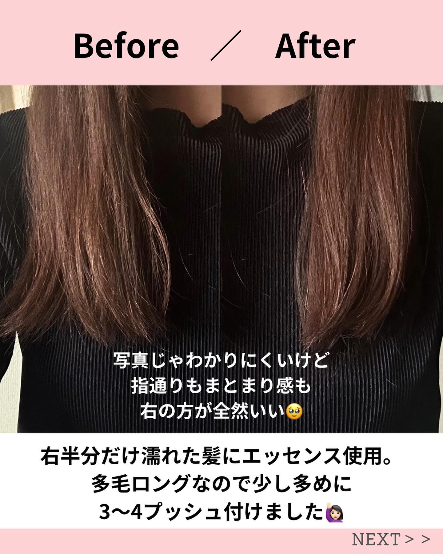 - 軽やかでサラッとしたテクスチャーでうるおいチャージし、ベタつきなくサラサラとした髪へ導くエッセンスです。