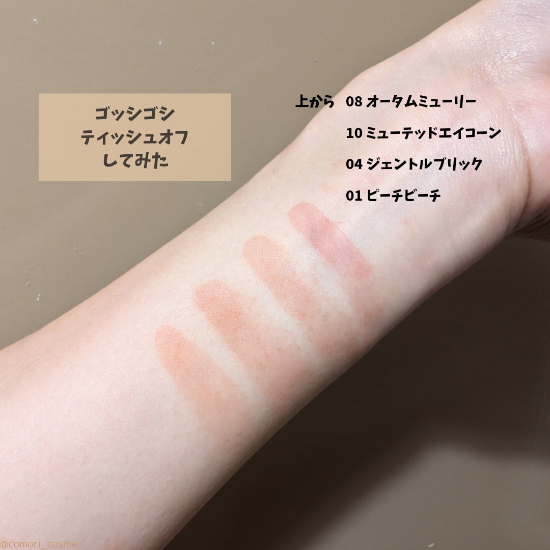 - <01 ピーチビーチ> 精製水、ジメチコン、BG、(ジメチコン/ビニルジメチコン)クロスポリマー、ステアリン酸ポリグリセリル-10、1,2-ヘキサンジオール、アクリル酸ヒドロキシエチル/ナトリウムアクリロイルジメチルタウリン酸共重合体二酸化チタン、エチルヘキシルグリセリン、黄色5 号、香料、ポリソルベート60、イソステアリン酸ソルビタン、赤色227号、カルボマー、アルギニン、水酸化酸化アルミニウム、ポリアクリル酸アンモニウム溶液、フェノキシエタノール、ブリリアントブルーFCF、トコフェロール、ヒアルロン酸Na、ヒアルロン酸ヒドロキシプロピルトリモニウム、ヒアルロン酸、加水分解ヒアルロン酸、加水分解ヒアルロン酸Na、ヒアルロン酸K、ペンチレングリコール、ヒアルロン酸クロスポリマーNaアセチルヒアルロン酸ナトリウム <02 スプリングライクピンク> 精製水、ジメチコン、BG、(ジメチコン/ビニルジメチコン)クロスポリマー、ステアリン酸ポリグリセリル-10、1,2-ヘキサンジオール、アクリル酸ヒドロキシエチル/ナトリウムアクリロイルジメチルタウリン酸共重合体二酸化チタン、エチルヘキシルグリセリン、黄色5 号、香料、赤色227号、ポリソルベート60、イソステアリン酸ソルビタン、水酸化酸化アルミニウム、ポリアクリル酸アンモニウム溶液、カルボマー、アルギニン、フェノキシエタノール、ブリリアントブルーFCF、トコフェロール、ヒアルロン酸Na、ヒアルロン酸ヒドロキシプロピルトリモニウム、ヒアルロン酸、加水分解ヒアルロン酸、加水分解ヒアルロン酸Na、ヒアルロン酸K、ペンチレングリコール、ヒアルロン酸クロスポリマーNaアセチルヒアルロン酸ナトリウム <03 オリエンタルルビー> 精製水、ジメチコン、BG、(ジメチコン/ビニルジメチコン)クロスポリマー、ステアリン酸ポリグリセリル-10、1,2-ヘキサンジオール、アクリル酸ヒドロキシエチル/ナトリウムアクリロイルジメチルタウリン酸共重合体エチルヘキシルグリセリン、黄色5 号、赤色227号、香料、イソステアリン酸ソルビタン、ポリソルベート60、カルボマー、アルギニン、赤色104号(1)、トコフェロール、ヒアルロン酸Na、加水分解ヒアルロン酸Na、ヒアルロン酸K、ヒアルロン酸ヒドロキシプロピルトリモニウム、ヒアルロン酸、加水分解ヒアルロン酸、ペンチレングリコール、ヒアルロン酸クロスポリマーNaアセチルヒアルロン酸ナトリウム <04 ジェントルブリック> 精製水、ジメチコン、BG、(ジメチコン/ビニルジメチコン)クロスポリマー、ステアリン酸ポリグリセリル-10、1,2-ヘキサンジオール、アクリル酸ヒドロキシエチル/ナトリウムアクリロイルジメチルタウリン酸共重合体エチルヘキシルグリセリン、二酸化チタン、黄色4号、赤色227号、香料、黄色5 号、ポリソルベート60、イソステアリン酸ソルビタン、カルボマー、アルギニン、水酸化酸化アルミニウム、ポリアクリル酸アンモニウム溶液、ブリリアントブルーFCF、フェノキシエタノール、トコフェロール、ヒアルロン酸Na、ヒアルロン酸K、ヒアルロン酸ヒドロキシプロピルトリモニウム、ヒアルロン酸、加水分解ヒアルロン酸、加水分解ヒアルロン酸Na、ペンチレングリコール、ヒアルロン酸クロスポリマーNaアセチルヒアルロン酸ナトリウム <05 ピンクメーター> 精製水、ジメチコン、BG、(ジメチコン/ビニルジメチコン)クロスポリマー、ステアリン酸ポリグリセリル-10、1,2-ヘキサンジオール、アクリル酸ヒドロキシエチル/ナトリウムアクリロイルジメチルタウリン酸共重合体二酸化チタン、エチルヘキシルグリセリン、黄色5 号、香料、赤色227号、イソステアリン酸ソルビタン、ポリソルベート60、赤色104号(1)、黄色4号、カルボマー、アルギニン、水酸化酸化アルミニウム、ポリアクリル酸アンモニウム溶液、フェノキシエタノール、ブリリアントブルーFCF、トコフェロール、ヒアルロン酸Na、ヒアルロン酸K、ヒアルロン酸ヒドロキシプロピルトリモニウム、ヒアルロン酸、加水分解ヒアルロン酸、加水分解ヒアルロン酸Na、ペンチレングリコール、ヒアルロン酸クロスポリマーNaアセチルヒアルロン酸ナトリウム <06 ピンクハイウェイ> 精製水、ジメチコン、BG、(ジメチコン/ビニルジメチコン)クロスポリマー、ステアリン酸ポリグリセリル-10、1,2-ヘキサンジオール、アクリル酸ヒドロキシエチル/ナトリウムアクリロイルジメチルタウリン酸共重合体エチルヘキシルグリセリン、二酸化チタン、香料、ポリソルベート60、イソステアリン酸ソルビタン、赤色104号(1)、黄色5 号、赤色227号、カルボマー、アルギニン、水酸化酸化アルミニウム、ポリアクリル酸アンモニウム溶液、フェノキシエタノール、トコフェロール、ヒアルロン酸Na、ヒアルロン酸K、ヒアルロン酸ヒドロキシプロピルトリモニウム、ヒアルロン酸、加水分解ヒアルロン酸、加水分解ヒアルロン酸Na、ペンチレングリコール、ヒアルロン酸クロスポリマーNaアセチルヒアルロン酸ナトリウム <07 ベリーフィズ> 