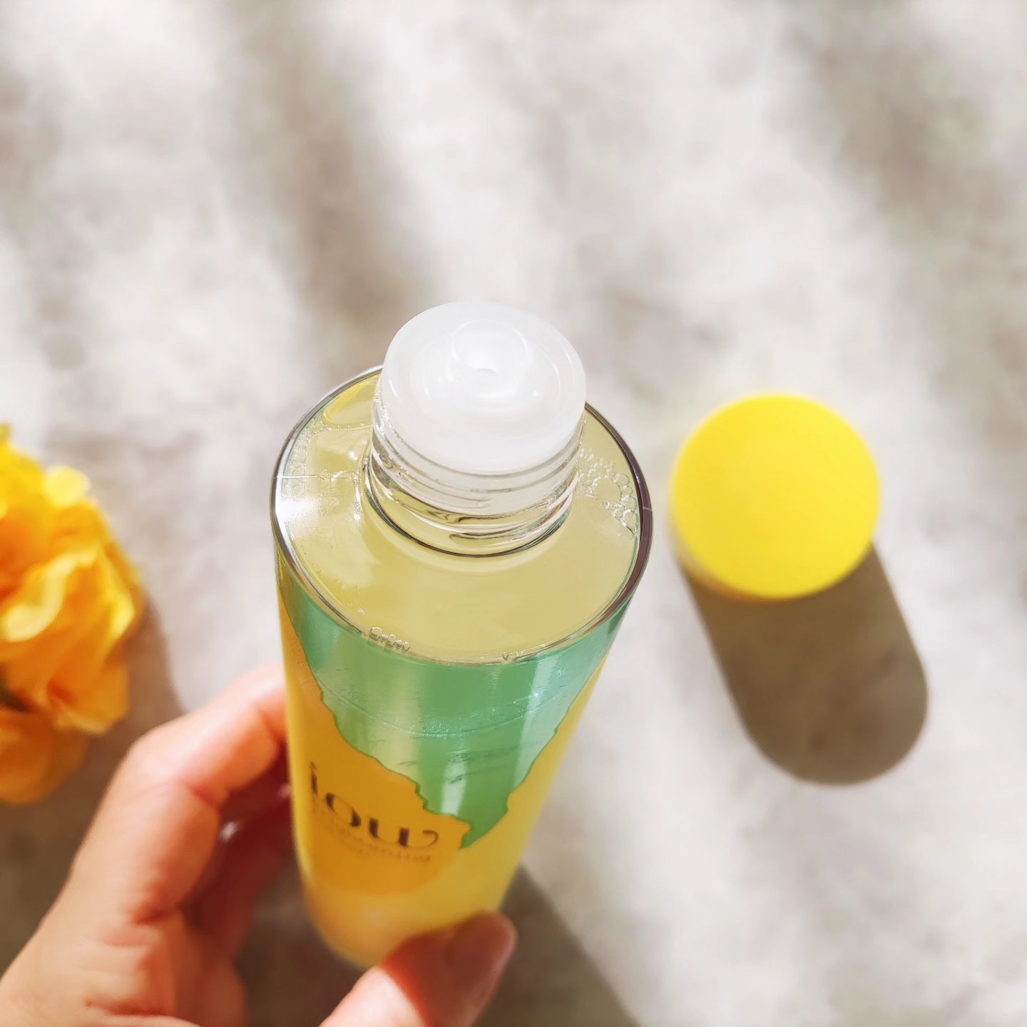 しっとりな使い心地がうれしい💛 高級感のあるガラスボトルがとっても素敵です! オイル層とローション層に分かれてるのでまずはよ~く振ってから使ってね。 オイルが入っているとは思えないようなサラッとしたテクスチャー✨ なじませると、みずみずしく しっとりとした使い心地です🤍 肌にほどよいツヤ感が出るので、ツヤ肌メイク好きの方にも向いている思う! 9つのフリー処方なのも、ゆらぎ肌にはうれしい処方だよね。