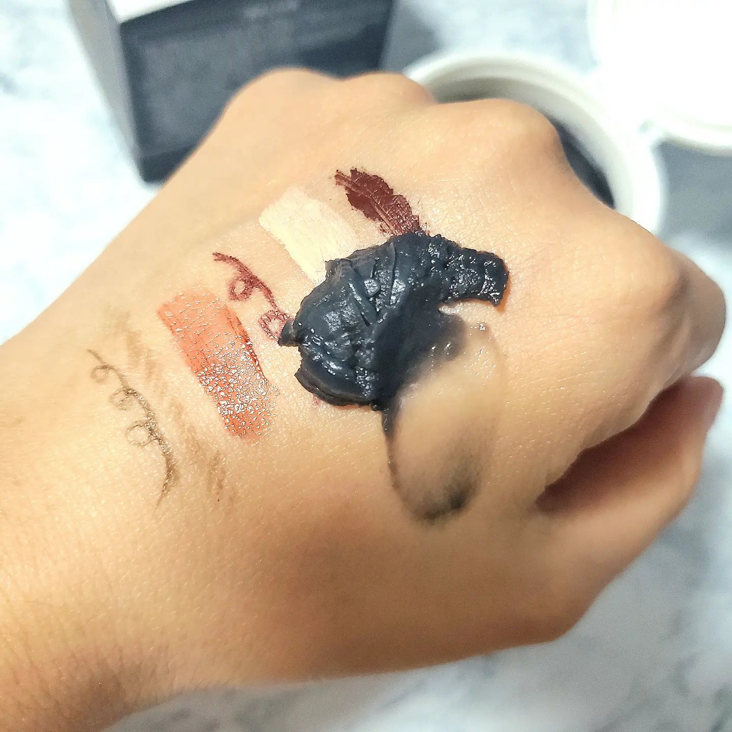 まつ毛の先端部分は透明であるということに着目した、新発想のまつ毛を染めるティント。 3日間朝晩連続の使用で、まつ毛の先端部分を染めあげ素まつ毛をいきいきさせてくれます。 スウォッチ、乾いたら擦っても全然落ちなかったのでまぶたにつかないようにつけた方が良いと思います。 寝方によっては、枕にもついてしまう可能性があるかもしれない、とのことです。 スキンケアの一番最後に使ってくださいとのことでしたがまつ毛美容液と併用する場合はティントの後に美容液を使用するのだそう。