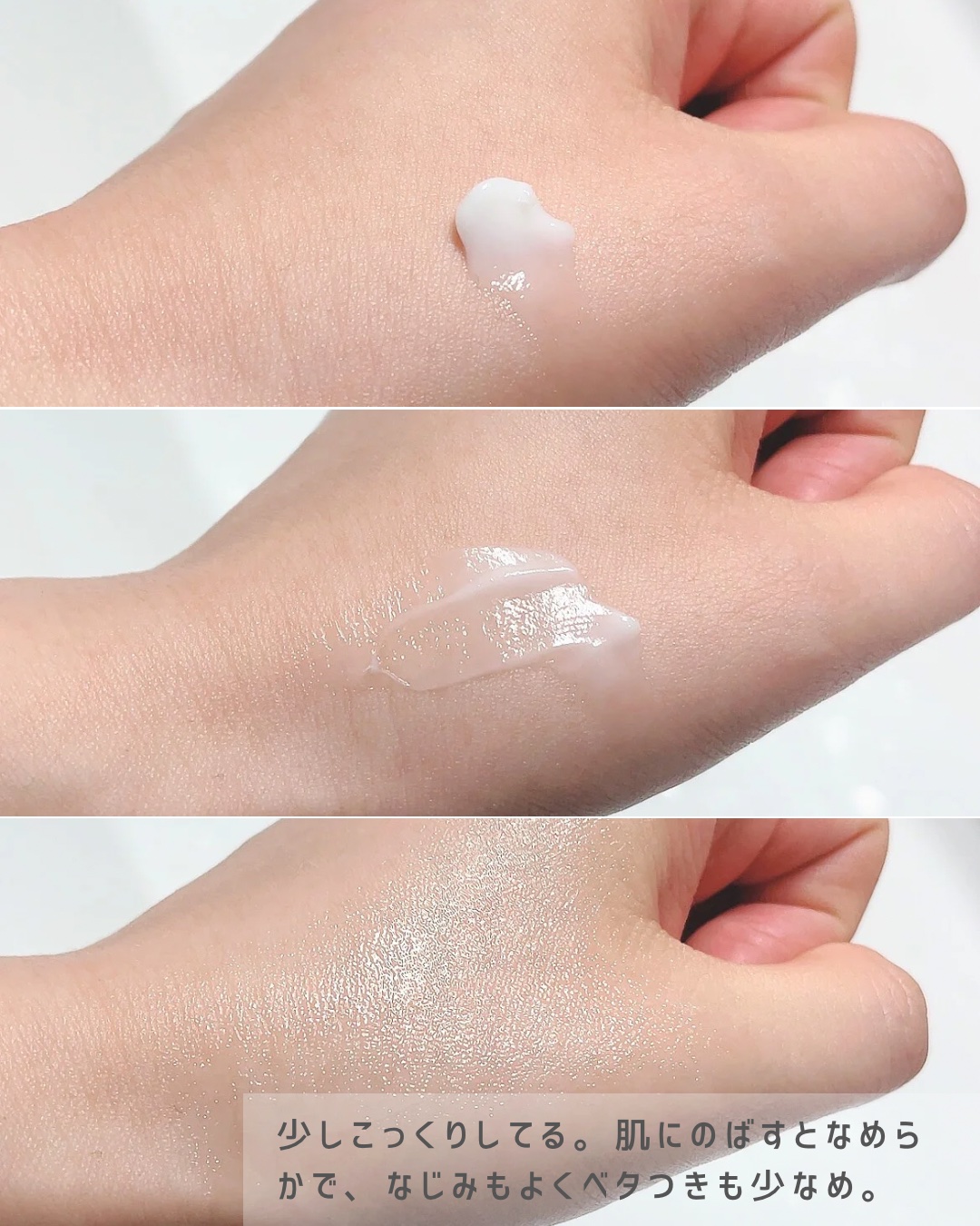 とろっとしたテクスチャーで つぶつぶが馴染みにくいけど砕けていく感じはあるからあくまで優しく優しく。 塗布後はつやぴっかーんでなかなか良い。 ハリとかはまだ変化分からないけど使用感は良かったから1本使い切るまで使ってみよう。