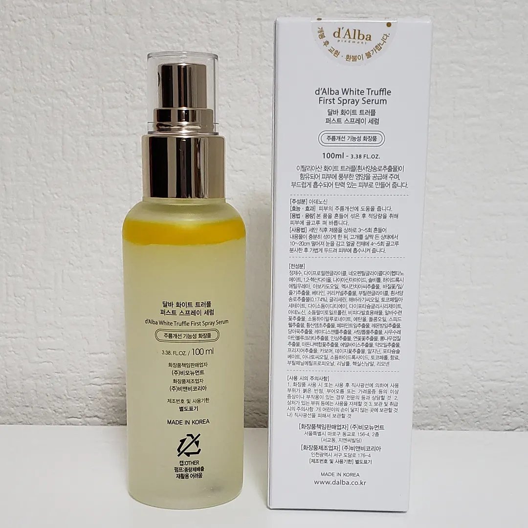 - イタリア産ホワイトトリュフ*と植物性オイルで豊かな水分を与えツヤ肌に仕上げる保湿ケアミストです。肌表面の保湿だけでなく、内側までしっかり二重で保湿可能。さらにダルバ独自のトリュフェロールTMが肌に弾力を与えます。霧のような細かなミストで洗顔後やお風呂上り以外のメイクの上からでもメイクを邪魔することなく使用することができます。 *ツベルマグナツムエキス(保湿成分) イタリアヴィーガン認証V-LABEL取得 皮膚低刺激テスト済み *全ての方に皮膚刺激が発生しないということではありません。 【ご使用方法】 1. 洗顔後、3~5回振って中身が十分に混ざった後、顔全体にまんべんなく噴射して軽くたたいて肌に馴染ませます。 * 鼻や口から吸い込まないように注意してください。 【使用上の注意】 お肌に異常が生じていないかよく注意して使用してください。化粧品がお肌に合わないとき即ち次のような場合には、使用を中止してください。そのまま使用を続けますと、症状を悪化させることがありますので、皮ふ科専門医等にご相談されることをおすすめします。 (1)使用中、赤味、はれ、かゆみ、刺激、色抜け(白斑等)や黒ずみ等の異常があらわれた場合 (2)使用したお肌に、直射日光があたって(1)のような異常があらわれた場合