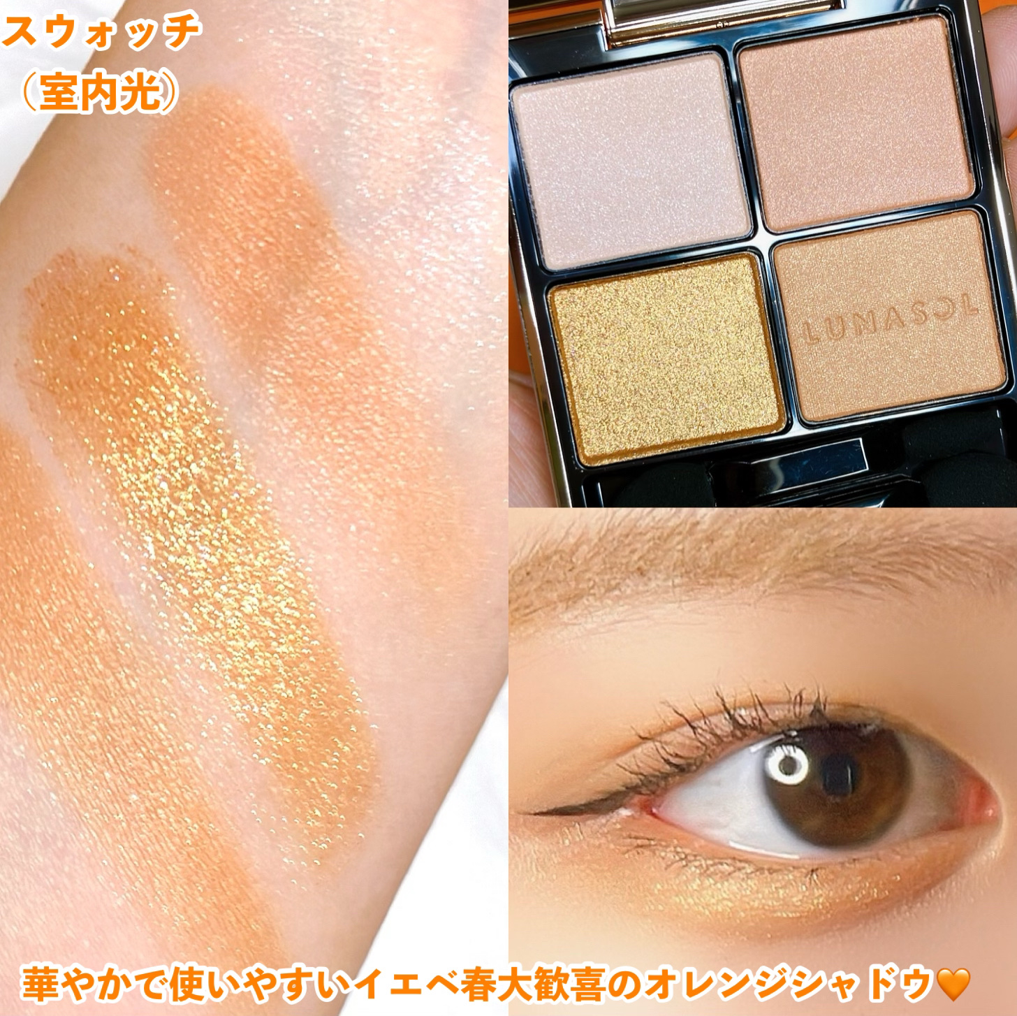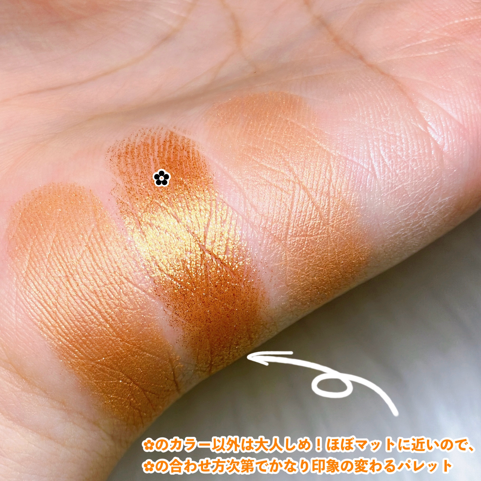 マットはかなりくすんだ色で、暗めのメイクに仕上がりがちに🤎 ツヤ感が大事だと言われるイエベ春でも、スモーキーメイク出来るんだ…!と思わせてくれたパレット。 愛して止まないミルクラテ、絶妙な柔らかベージュに透明感たっぷりのラメ✨️ 全色ラメ入りですが、真ん中2色のくすみと黄みが強く、どんよりした目元に…🥲 コーラルは大好きなんですが、このパレットは3滴白みを足したような色で、発色も弱くまぶたにも乗りづらく、かなり色白さんでないと使えない気がします…🥲 手持ちの中で1番黄み強いですが、1番完成度の高いです💕