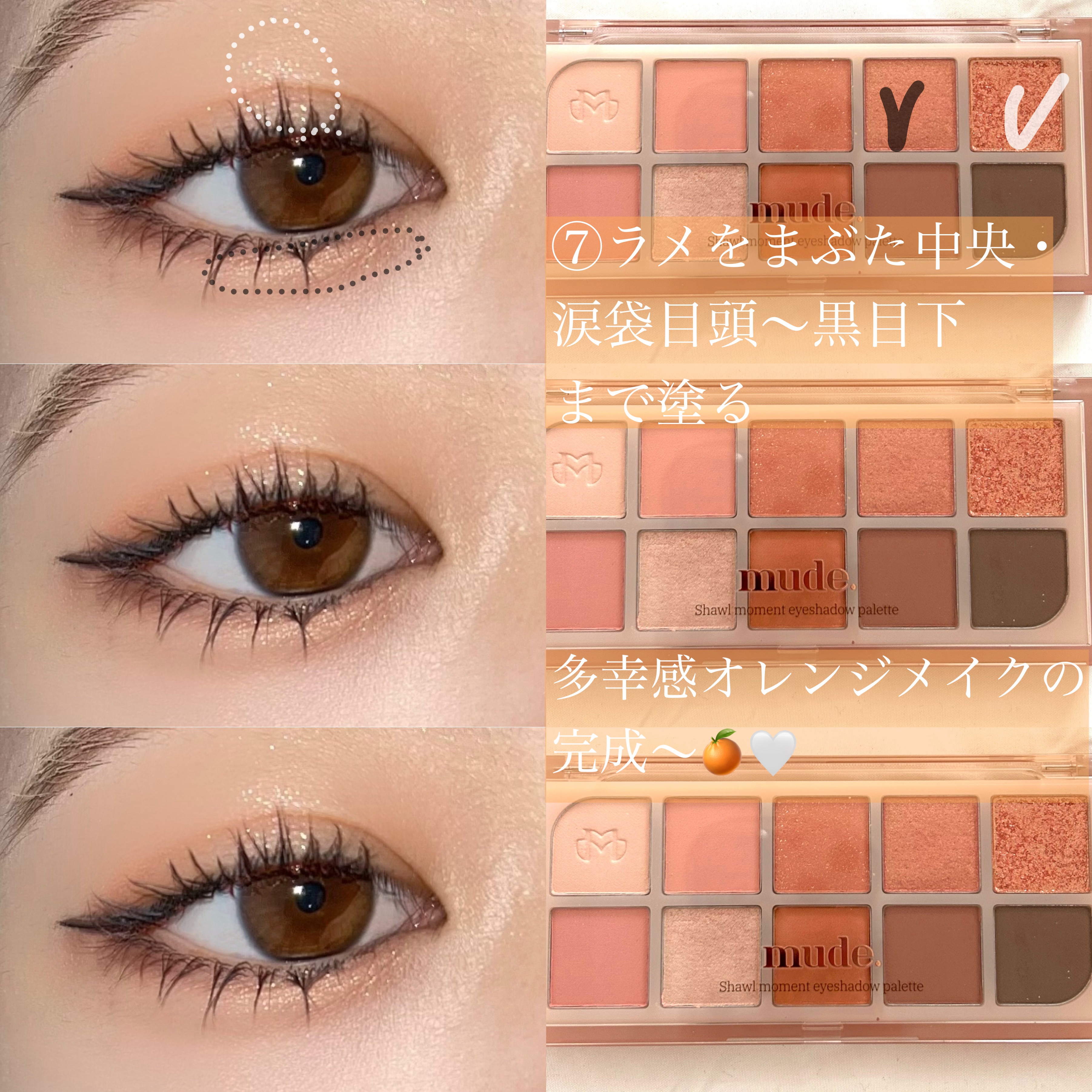 多幸感溢れる💗ピーチコーラルなアイシャドウパレット🍑mudeMDショールモーメントアイシャドウパレット03ピーチメモリー私的おすすめなカラー&使い方は2つあります!!1つ目は、下段中央のコーラルオレンジをメインに使う♡個人的にはこのカラーが1...