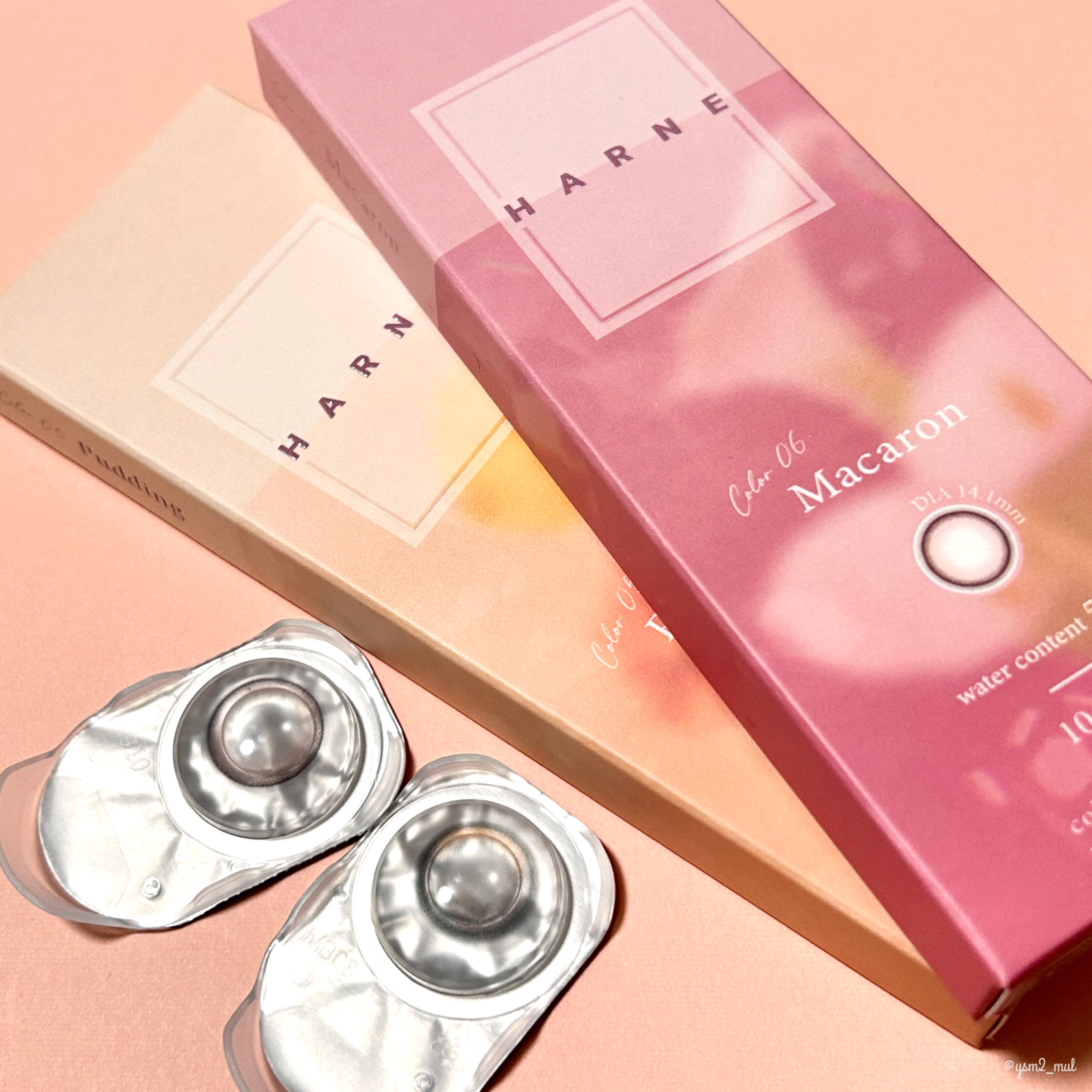 HARNE新色としてマカロンの色違いカラー フィナンシェ&チャイナブルーが登場したよ🪽 てんちむちゃんのこだわりポイントはズバリ色!浮いたり馴染みが悪くならないように色素薄い色を狙いすぎない程よいうっすらベージュ✨ 黒目がつけても派手見えしない絶妙なニュアンスブルーが綺麗すぎる💎