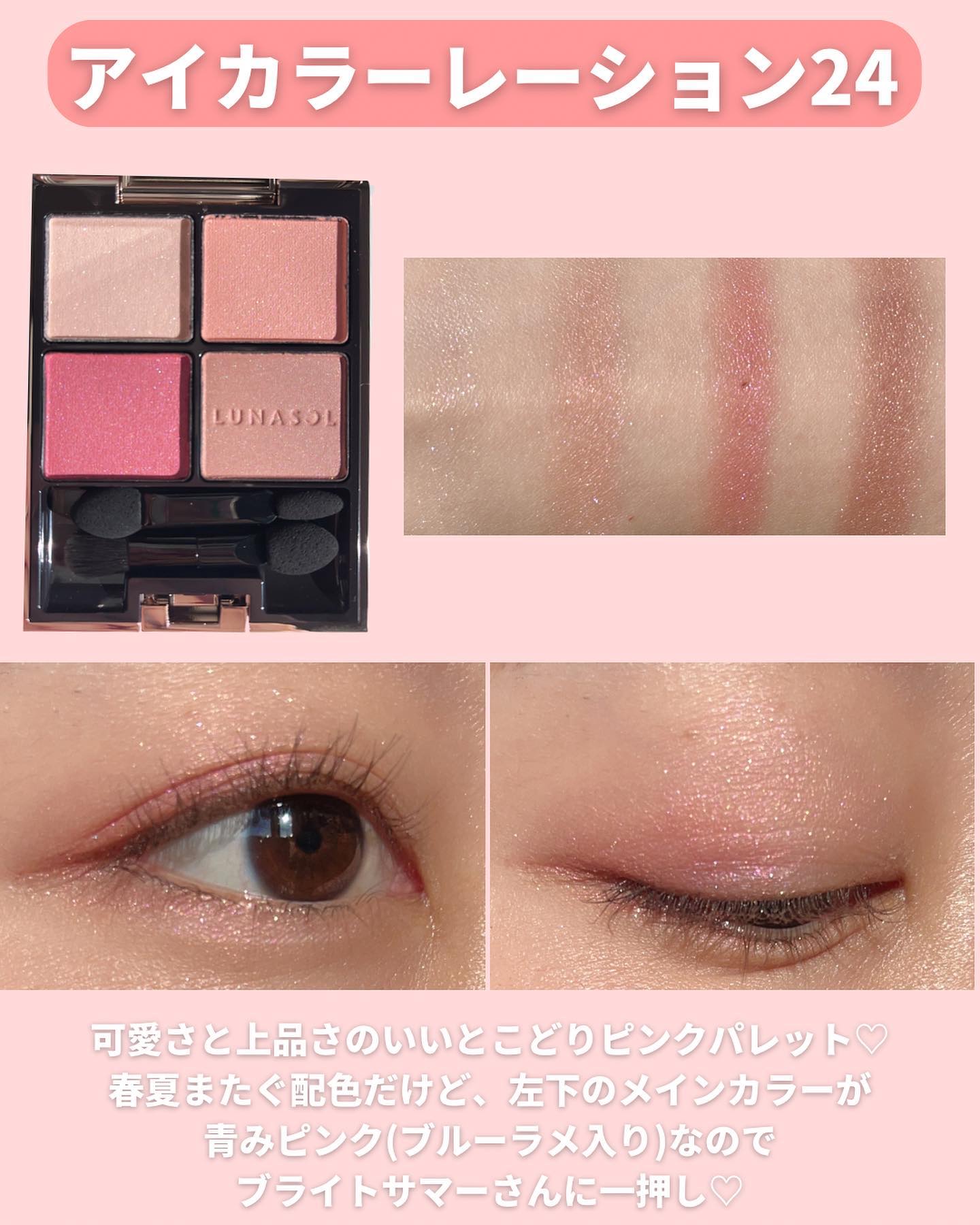 ルナソルのピンクはラメ感控えめなのでオフィスメイクにおすすめ🙆🏻♀️✨ CHANELはかなり万能だと思っていて、柔らかく仕上げればイエベ春の私ももちろんハマるし✨ ブランドごとにもちろん特徴がありますし、ピンクといってもパレットによって仕上がりはさまざま!