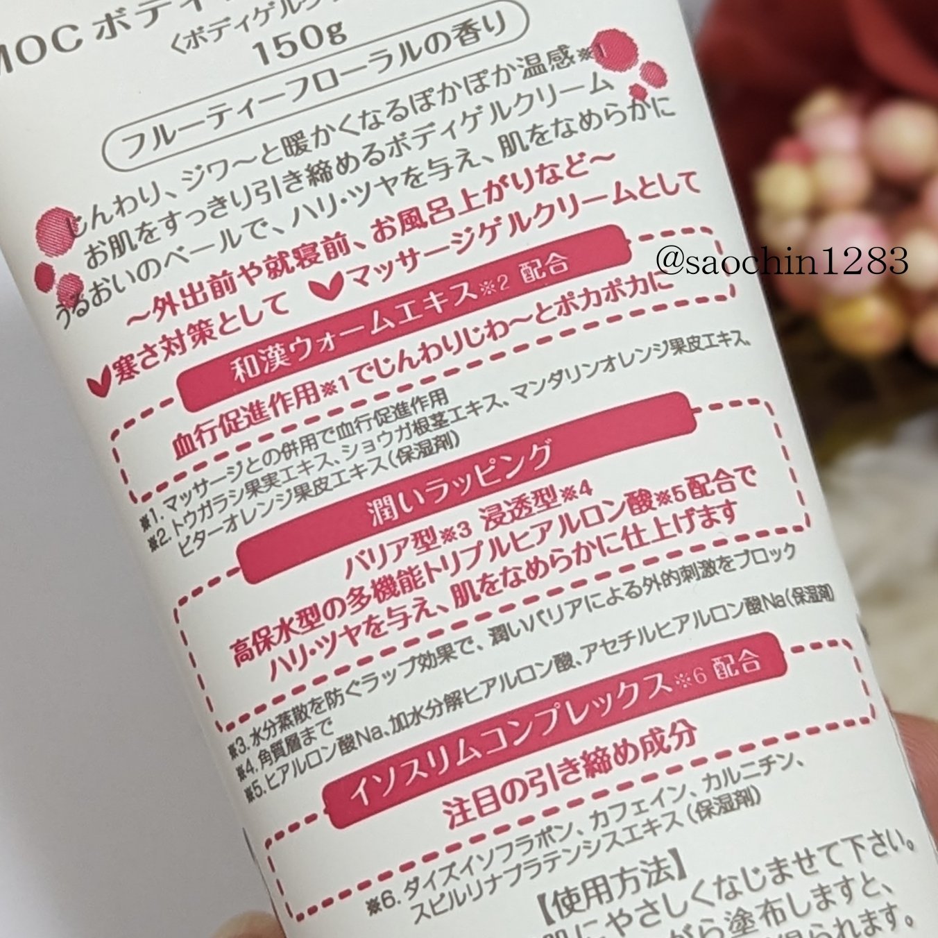 - じんわりと暖かくなるぽかぽか温感※ボディクリーム。 ゲル状のべたつきにくいクリームがお肌を引き締め、うるおいのベールで肌をなめらかに整えます。 血行促進 ※作用でじんわりじわ~とポカポカに ※マッサージによるもの 【フルーティーフローラルの香り】 *入浴前のご使用はお控え下さい。 *温感を感じるまでに5分程度かかる場合があります。 *温感(強さ・持続時間)には個人差があります。 *使用後は手を洗うなどし、目をこすったり、粘膜に触れたりなどはしないようご注意ください。