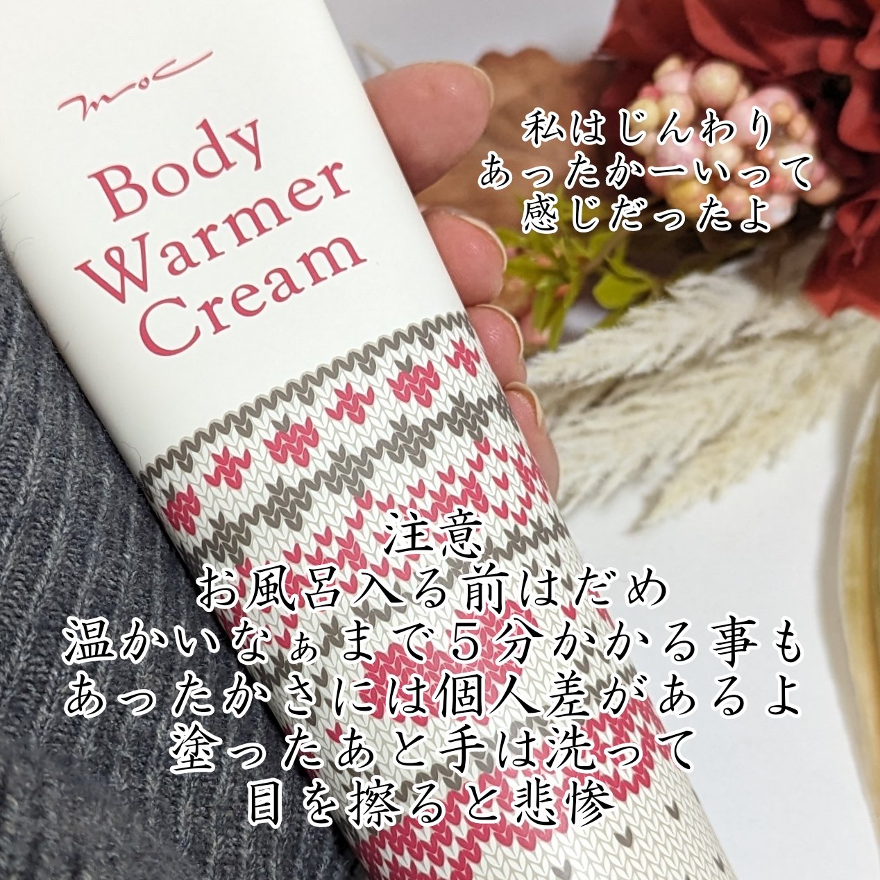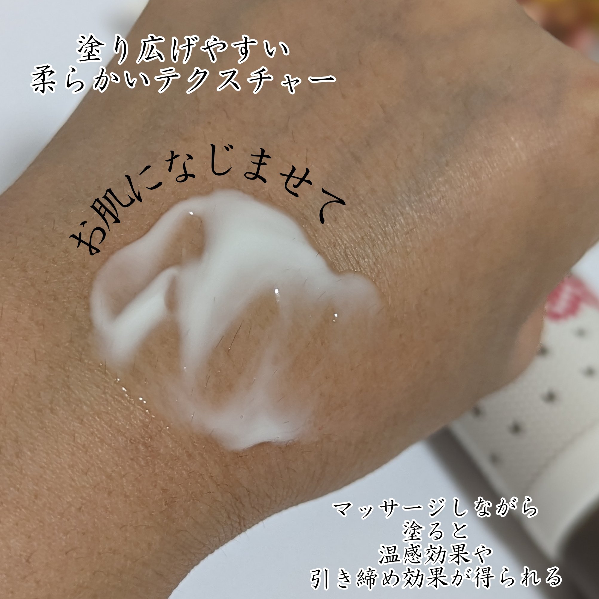 テクスチャーはゆるめでしっかりのびてくれます✨ 個人的には普通に塗るだけより、マッサージした方が温かくなりやすい感じがした🤔 たっぷり手に取って1〜2分マッサージしてるとじんわり温かくなってくるよ ベタつかないから塗ったあとすぐに服を着れるのもお気に入りポイント♥️