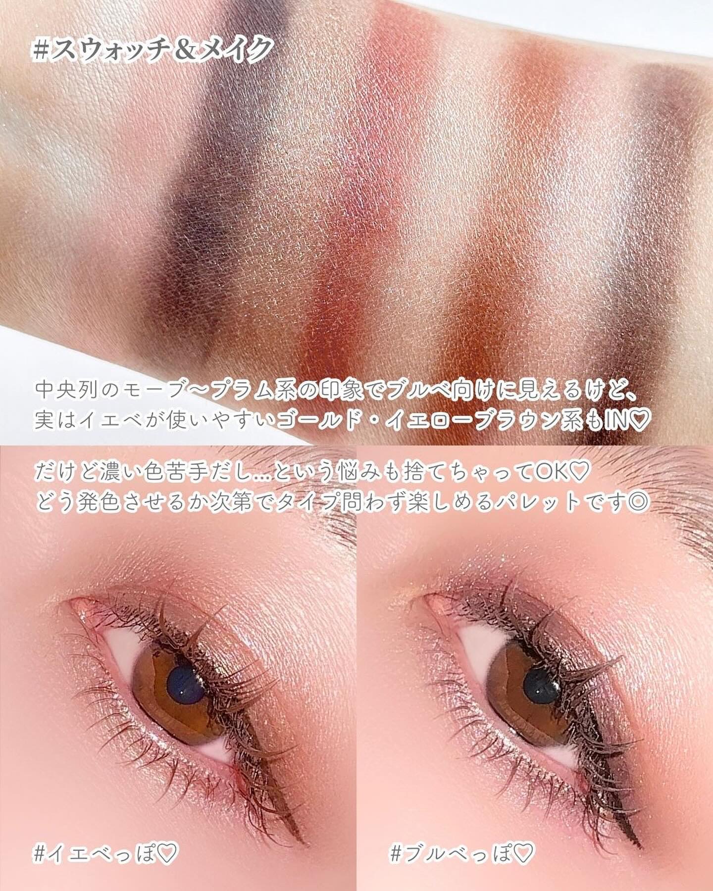 カラーバリエーションが豊富なので 使いやすいマットカラー3色に 透明感のあるパール(左下)1色というのが ブラウンパレットだけでも3種類あるので 捨て色なしでデイリーに使いやすいものばかりなので
