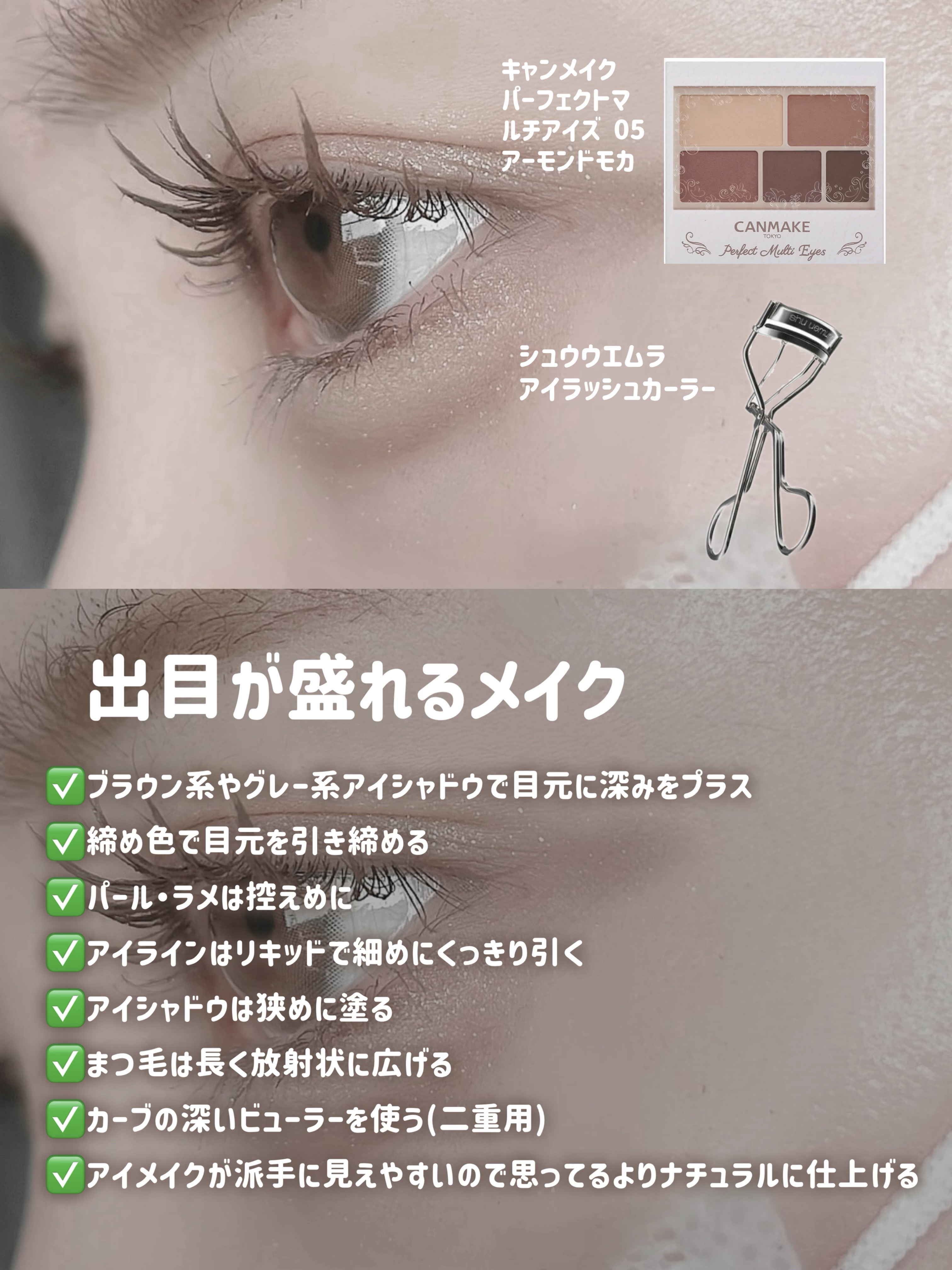 あなたの目の形に似合うメイクを紹介します🙌🏻 奥目さんのメイクポイントでは、引き締め効果のある黒は避けることが重要です。 出目さんのメイクポイントでは、締め色で目元を引き締めると立体感が出ます。