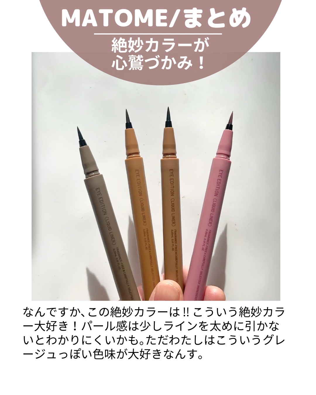 - 潤んだツヤを放つグロウパールで、 目尻ラインを印象的に引き立てるリキッドアイライナー 〇潤んだようなツヤを放つ高輝度なグロウパールと、絶妙ニュアンスカラーで目尻を引き立てる。 〇コシがあり、ブレずに描きやすい筆。 ー職人による手組み×専用設備で仕上げた高品質な筆 ー厳選した2種の毛を混毛 ー高輝度なグロウパール配合にも適した構造 〇つけたての仕上がりが長時間持続。 〇汗・皮脂・涙・こすれ・湿気に強い 〇ウォータープルーフ 〇お湯で簡単に落とせる。 〇美容液成分配合 ー保水成分(ヒアルロン酸) 〇無香料 〇アレルギーテスト済(すべての方にアレルギーが起きないというわけではありません)