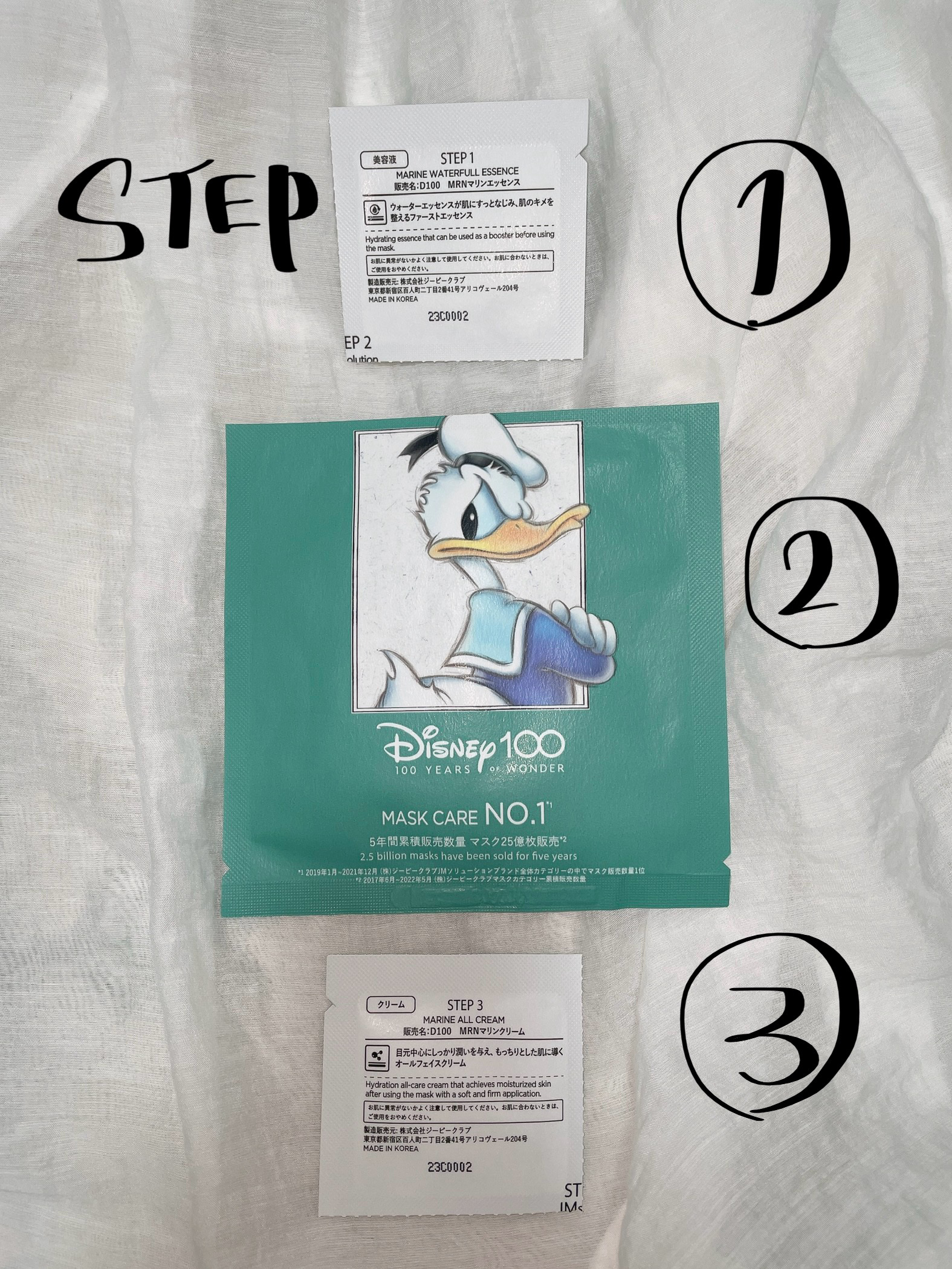 これ普通にフェイスマスクが1枚入ってるだけかと思ってたら、美容液とクリームもついてて、スキンケアがこれ1パックだけで済む優れものだった。空けてビックリしたよ。 洗顔後この流れで使うだけでスキンケア完了!なんて良いんだ。旅行、サ活、ジムとか、サッと持っていけて軽いし重宝するのでは? 3STEPとも使いやすく癖のないスキンケアだったので、万人受けしそう。