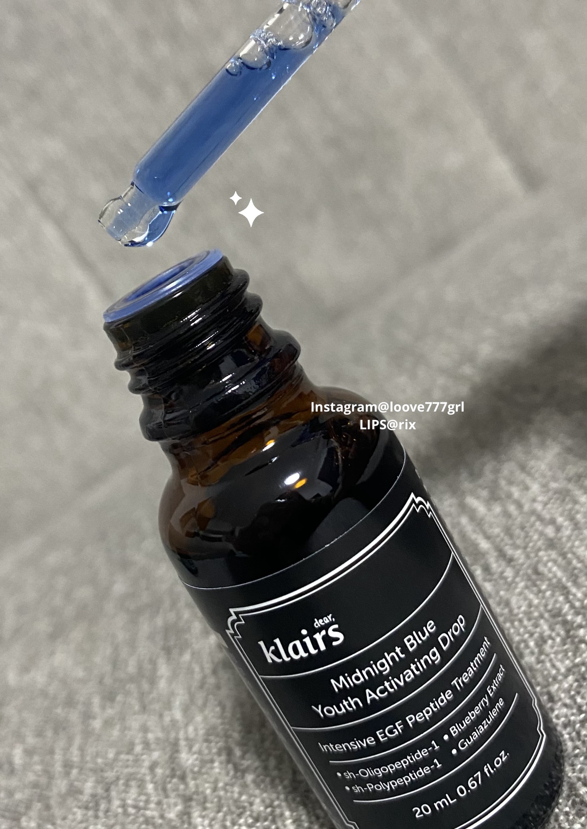 青い美容液&クリーム!!Klairsミッドナイトブルーユースアクティベーティングドロップ🌸ミッドナイトブルーカーミングクリーム青いのは着色料ではなく、植物成分の天然原料グアイアズレンが含まれているから💡グアイアズレンとは、炎症を抑える医薬品に...
