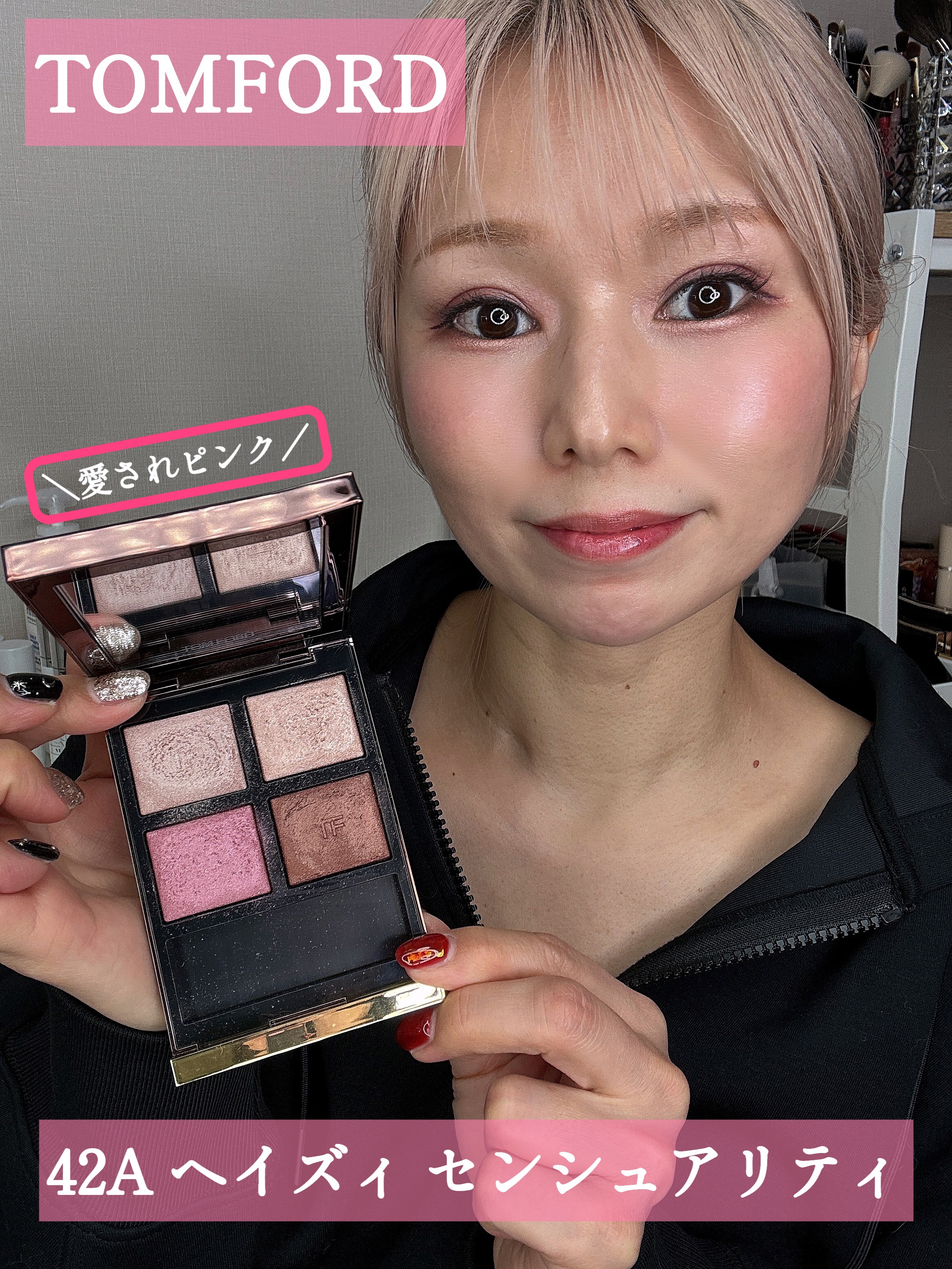 トムフォード アイ カラー クォード 02S ローズ ベール(限定) ¥12,980 これ本当に可愛いの🥹パレットで見ても可愛いけど塗ると更に可愛い。 マットは驚くほど粒子が細かくて発色が良い🙆♀️ 粉感を一切感じない仕上がりで、まぶたが着色されたかのように滑らかに色づきます🫶🤍 私は特に右上が好き!淡いコーラルピンクのベースにゴールドラメが煌めいて本当に綺麗💭💖 涙袋に入れてもツヤツヤキラキラな仕上がりになって可愛かったです🎀